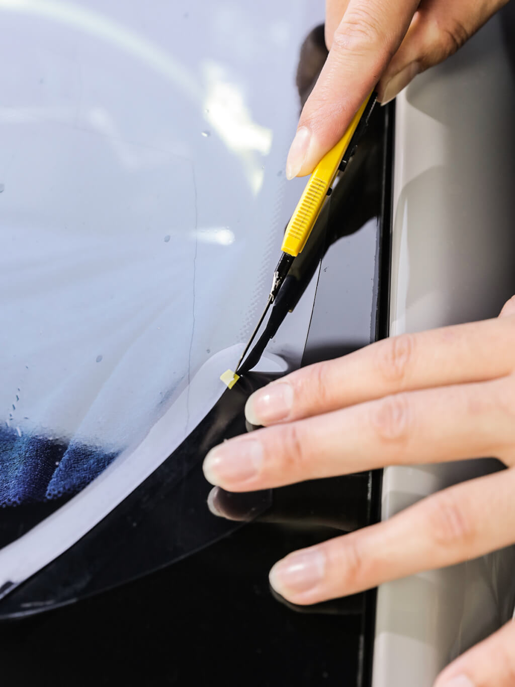 为解决隔热膜手工裁剪易划伤车漆的痛点,车艺尚研发垫片裁膜技术,在刀片与车窗间加入防护垫片,物理杜绝施工中对车窗玻璃的损伤。