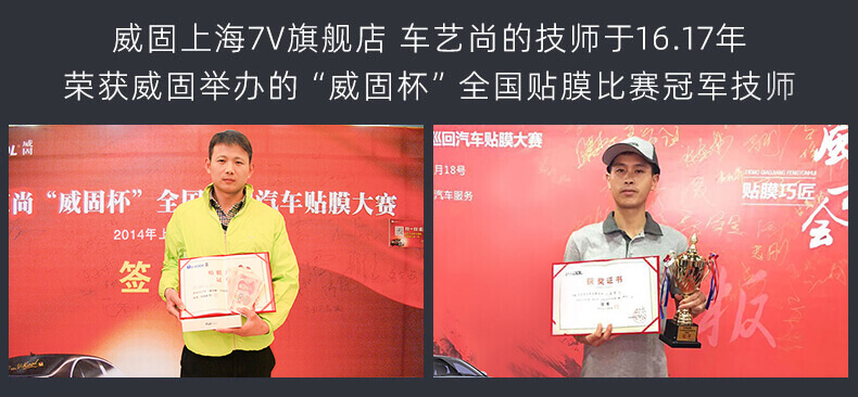 车艺尚御水路旗舰店是威固官方授权的7V不凡门店,符合威固7大评级标准中的所有条件,致力于用出众的贴膜服务为车主带来不凡贴膜体验。官方授权,品质保障。