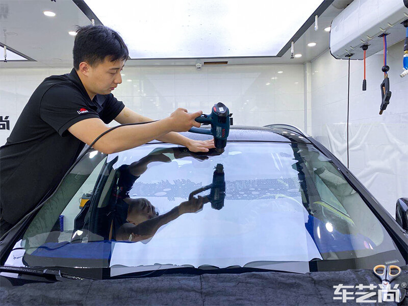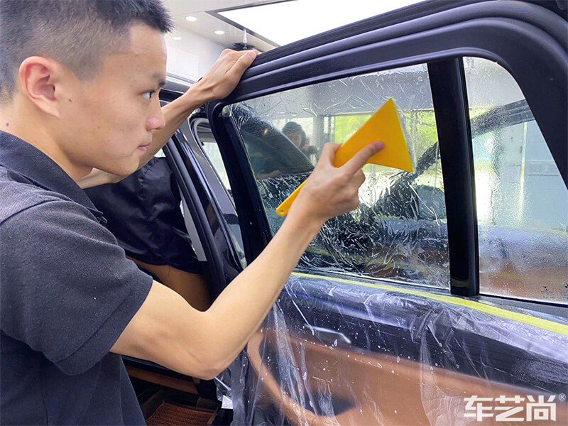车艺尚技师不同施工部位采用不同的赶水手法与工具,确保膜与玻璃的充分贴合,无气泡、无翘边。