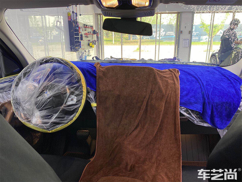 车艺尚贴膜技师在施工中采用500ML微水施工(市面上一般采用3000ML,甚至更大的用水量),避免因为用水过多对内饰、仪表盘、真皮座椅、电路系统等引起受潮发霉或短路危险。