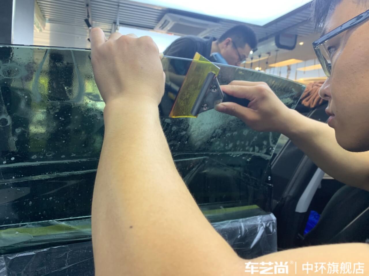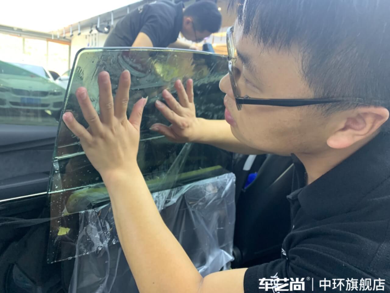 车艺尚技师不同施工部位采用不同的赶水手法与工具,确保膜与玻璃的充分贴合,无气泡、无翘边。
