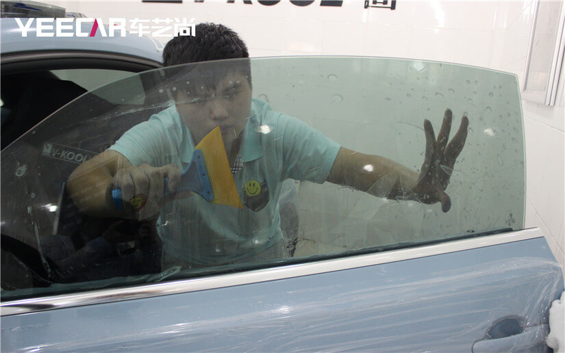● 前挡贴膜赶水,利用工具将多余的水赶出来,使玻璃与膜粘合