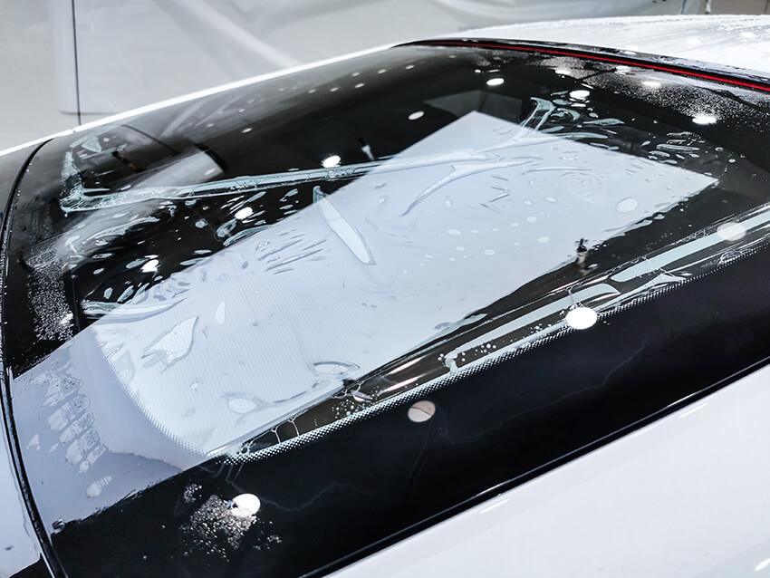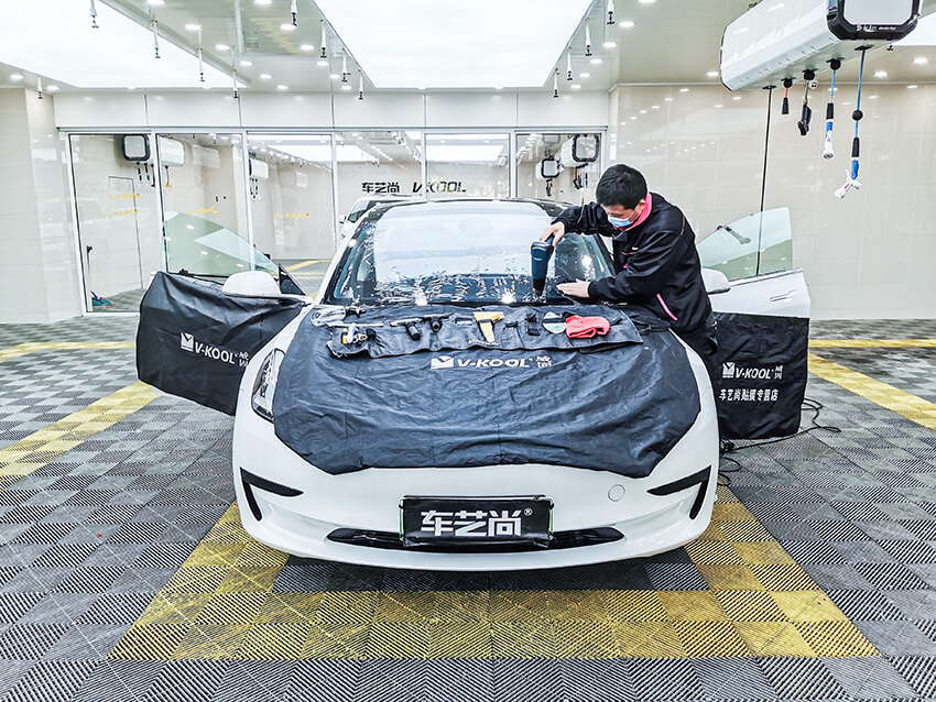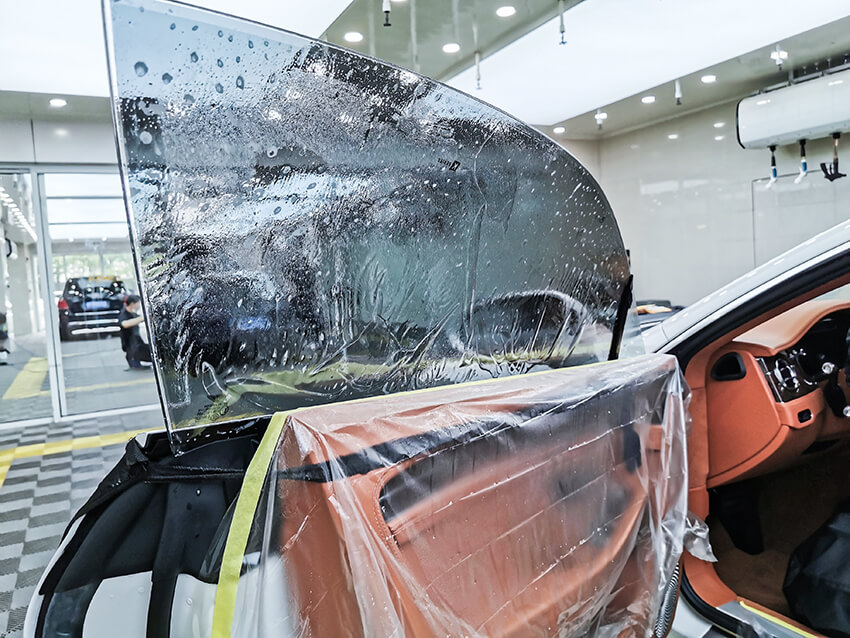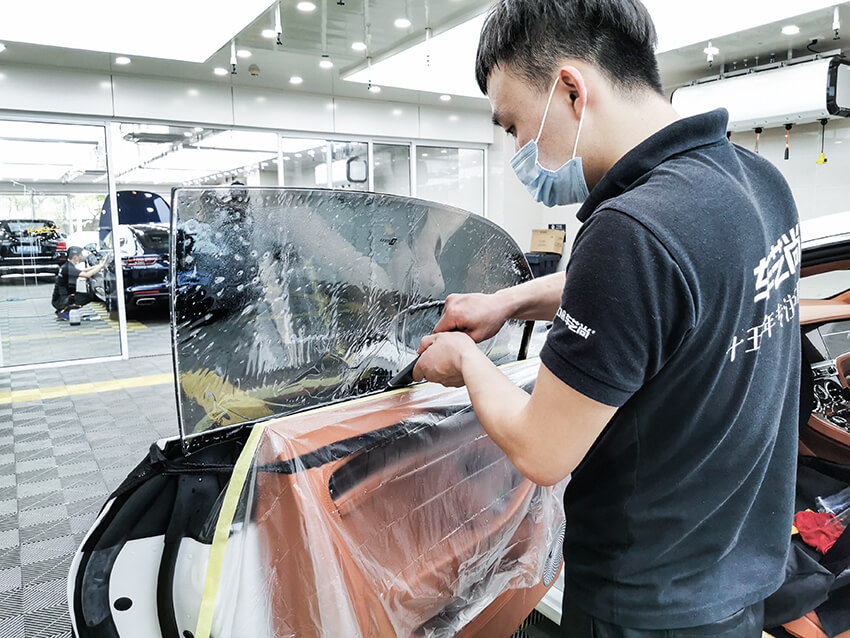 车艺尚技师不同施工部位采用不同的赶水手法与工具,确保膜与玻璃的充分贴合,无气泡、无翘边。