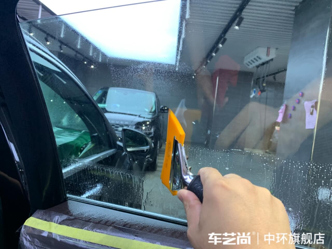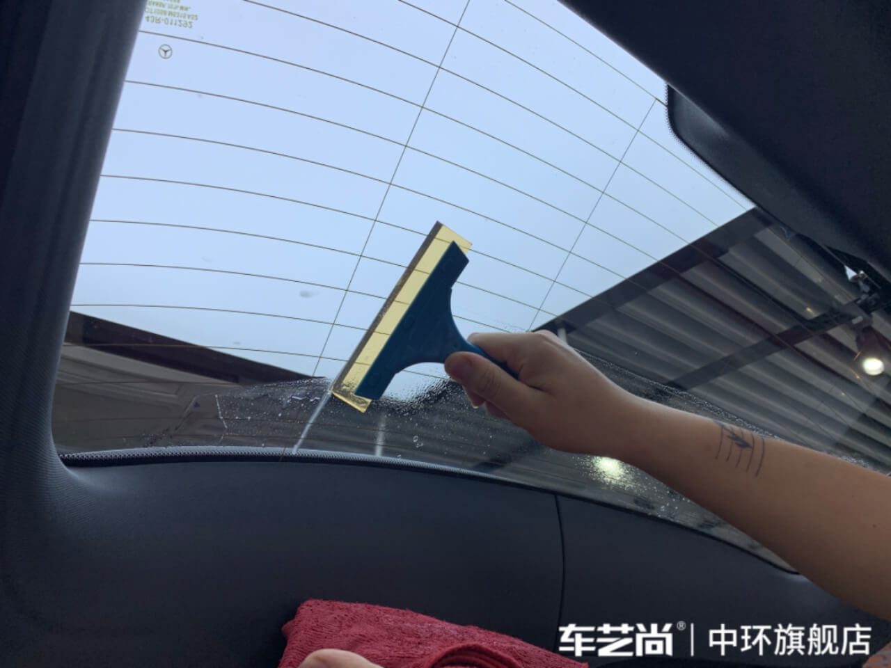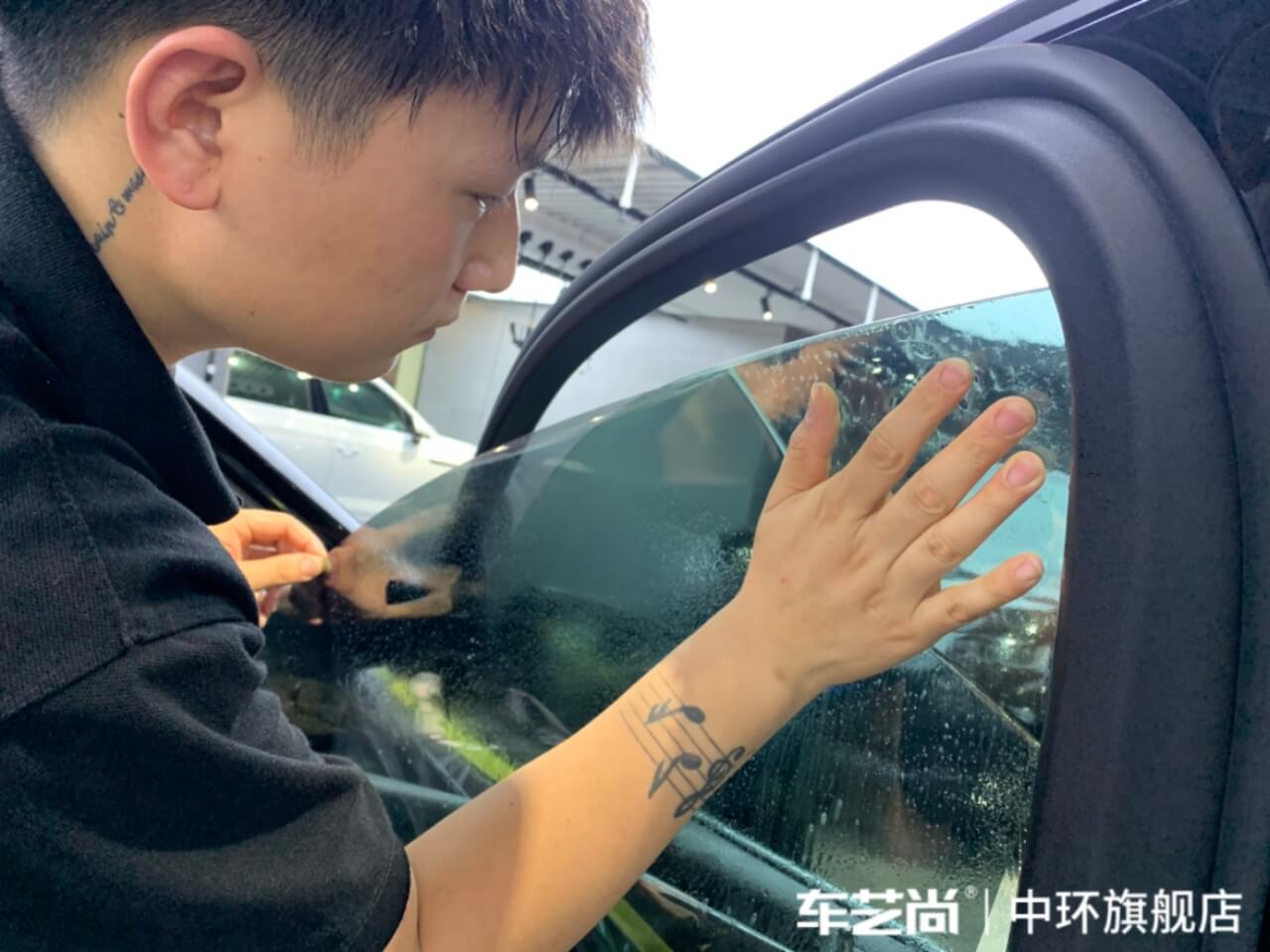 车艺尚技师不同施工部位采用不同的赶水手法与工具,确保膜与玻璃的充分贴合,无气泡、无翘边。