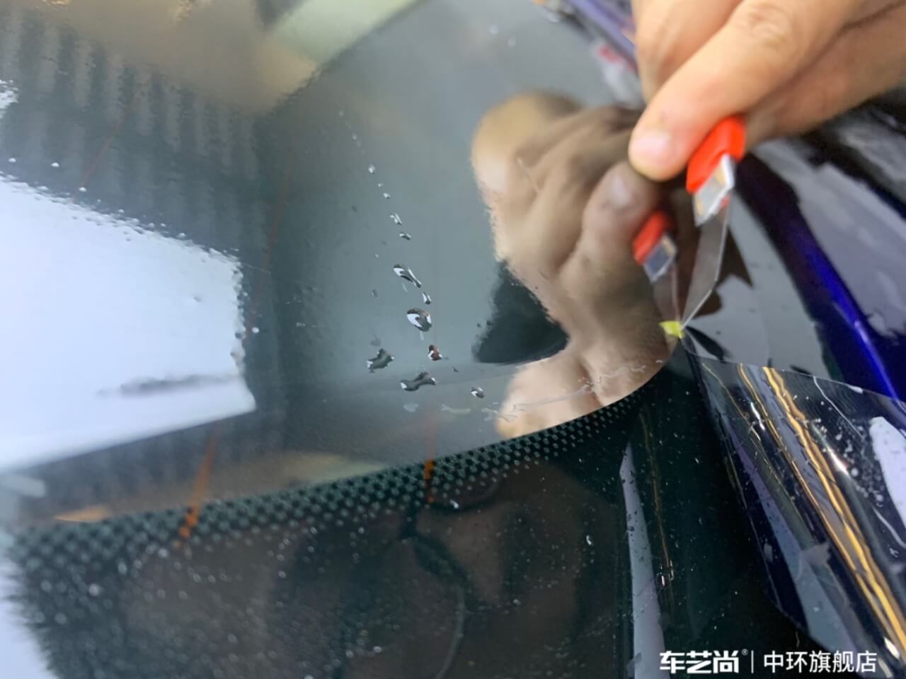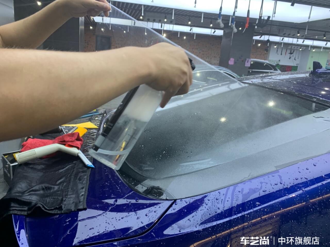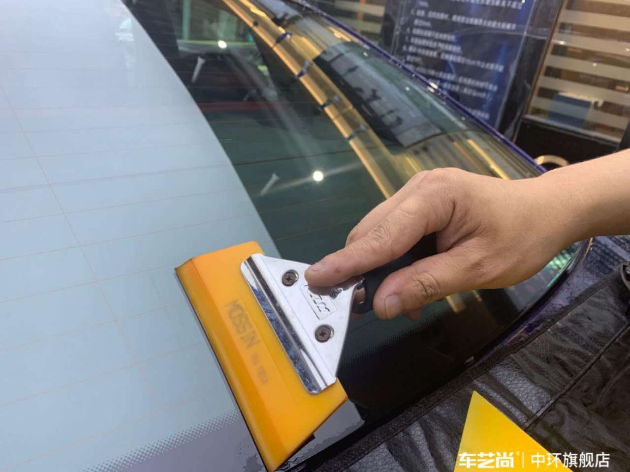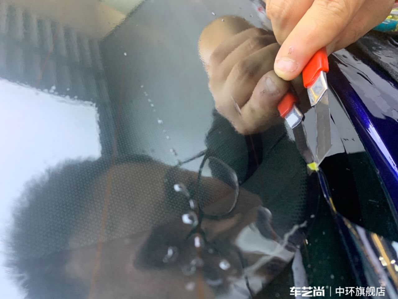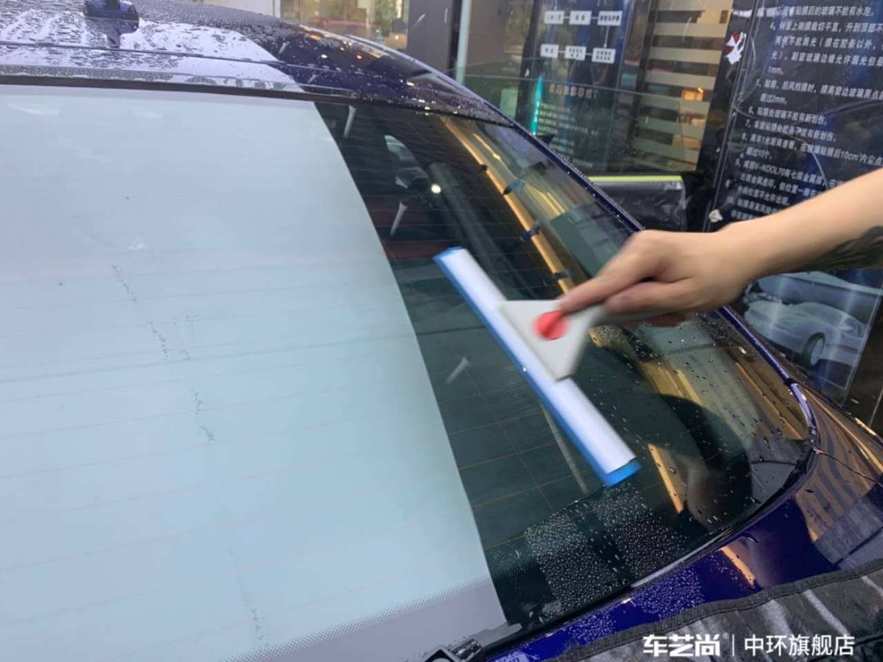 车艺佳技师不同施工部位采用不同的赶水手法与工具,确保膜与玻璃的充分贴合,无气泡、无翘边。