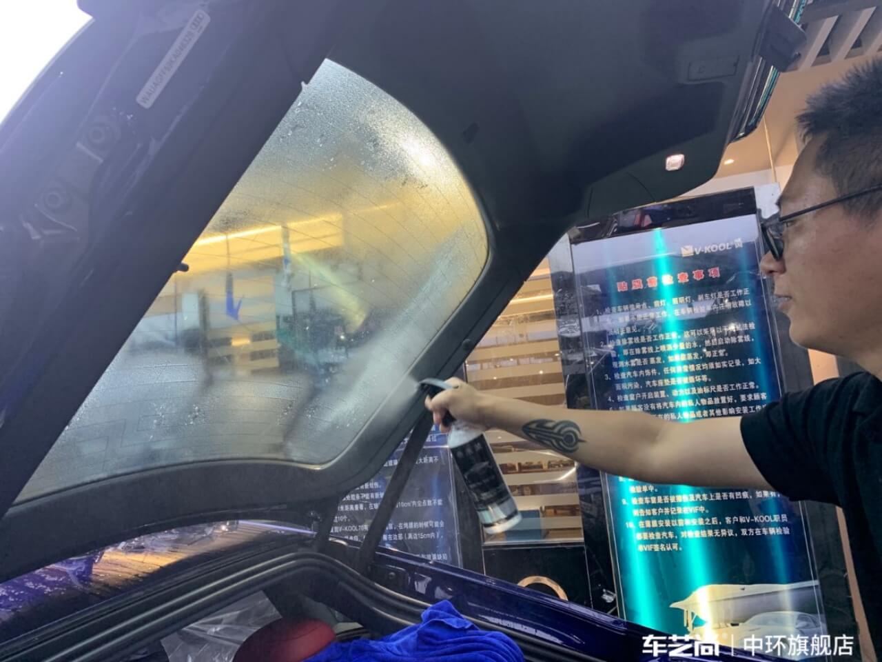 贴膜技师在施工中采用500ML微水施工(市面上一般采用3000ML,甚至更大的用水量),避免因为用水过多对内饰、仪表盘、真皮座椅、电路系统等引起受潮发霉或短路危险。