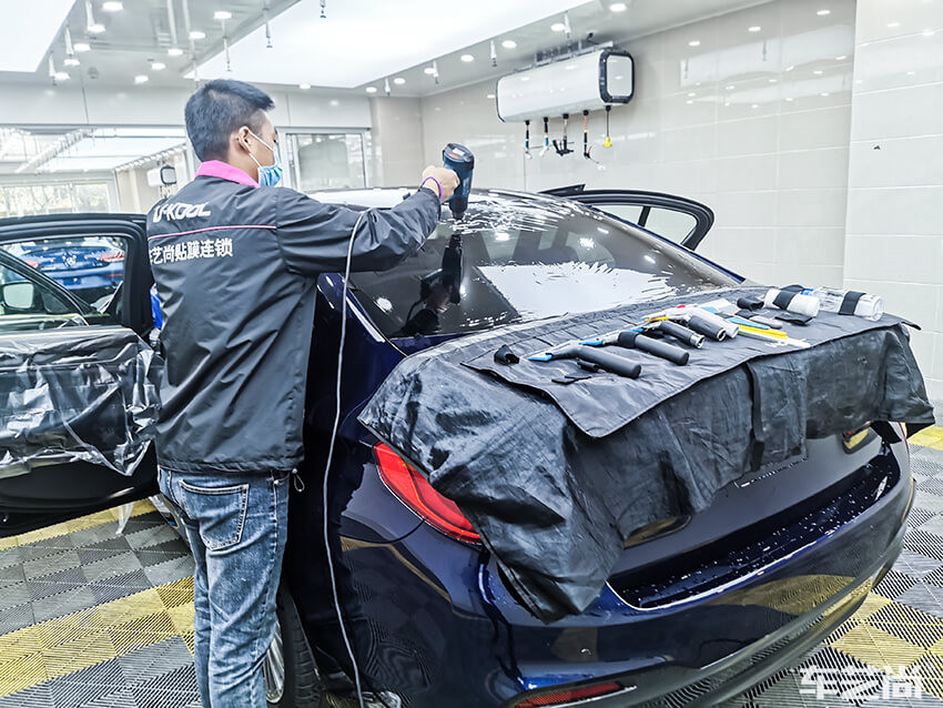 车艺尚技师不同施工部位采用不同的赶水手法与工具,确保膜与玻璃的充分贴合,无气泡、无翘边。