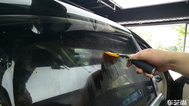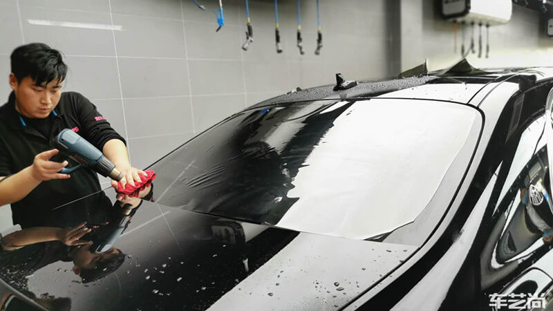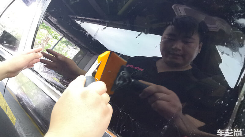 车艺尚技师不同施工部位采用不同的赶水手法与工具,确保膜与玻璃的充分贴合,无气泡、无翘边。