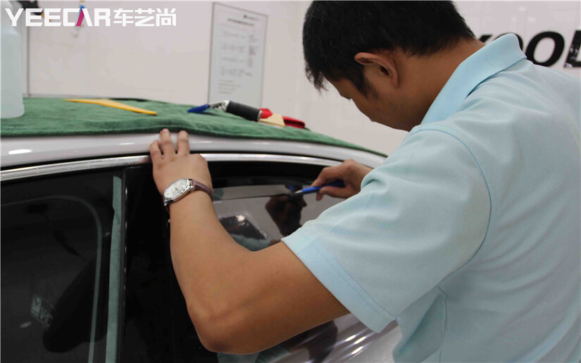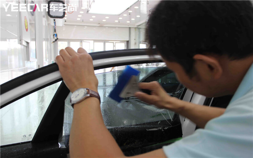 ● 技师耐心细致的做车内门板保护 防止贴膜时电气开关进水