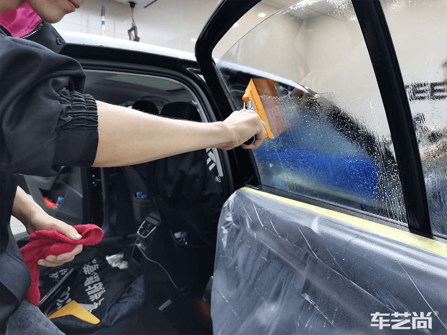 车艺尚技师不同施工部位采用不同的赶水手法与工具,确保膜与玻璃的充分贴合,无气泡、无翘边。