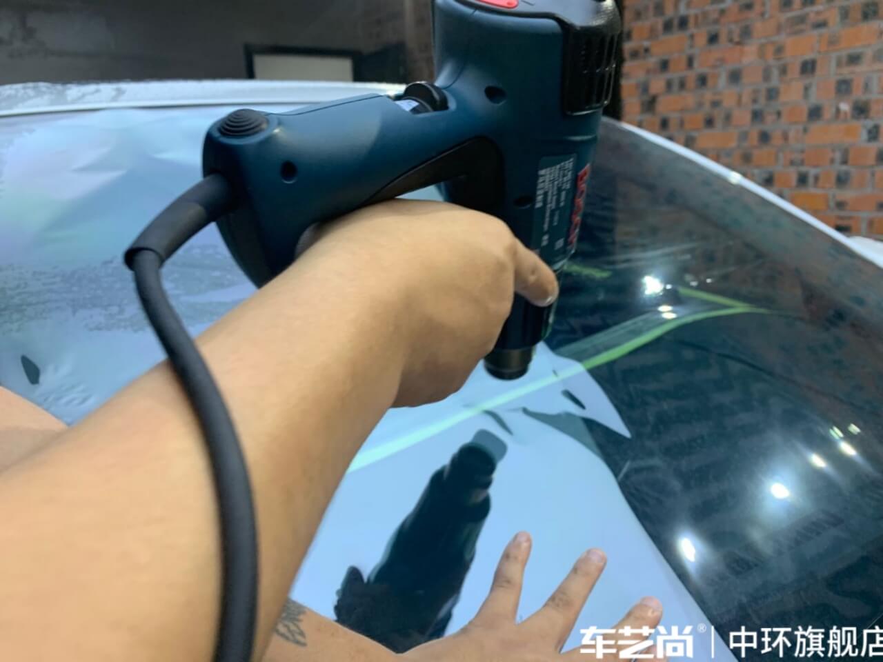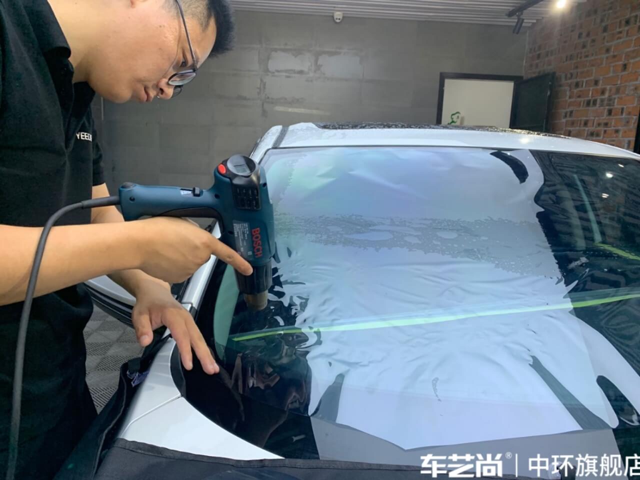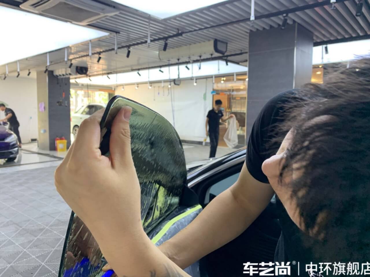 车艺尚技师不同施工部位采用不同的赶水手法与工具,确保膜与玻璃的充分贴合,无气泡、无翘边。