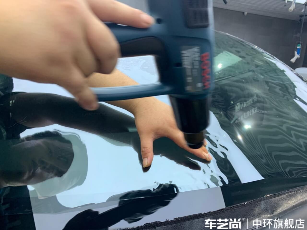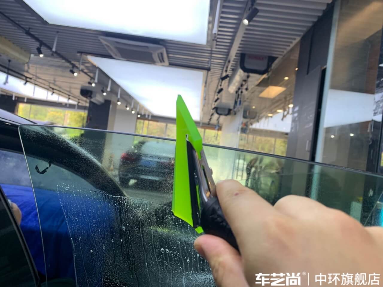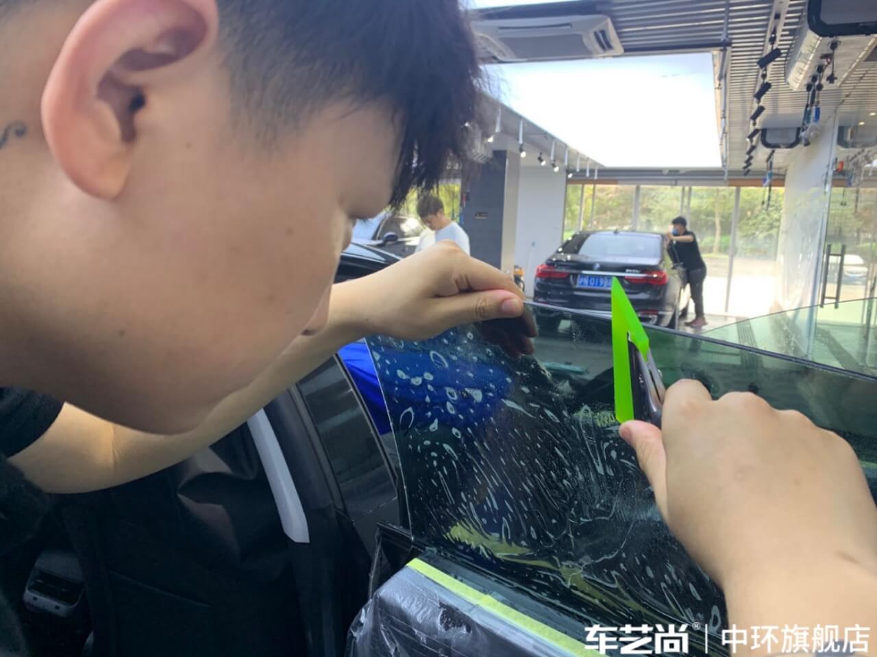 车艺尚技师不同施工部位采用不同的赶水手法与工具,确保膜与玻璃的充分贴合,无气泡、无翘边。