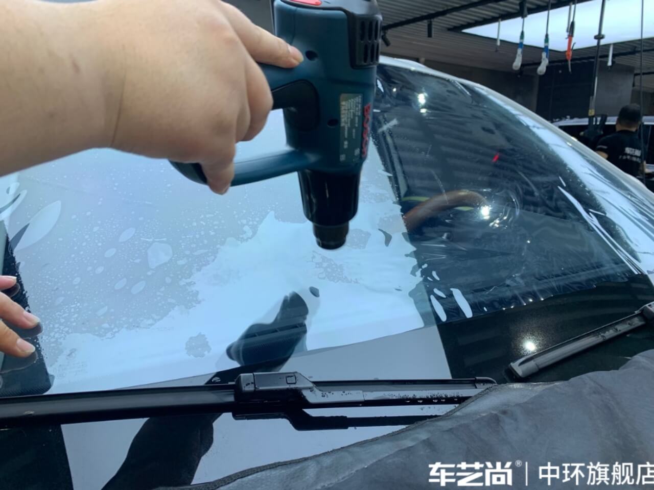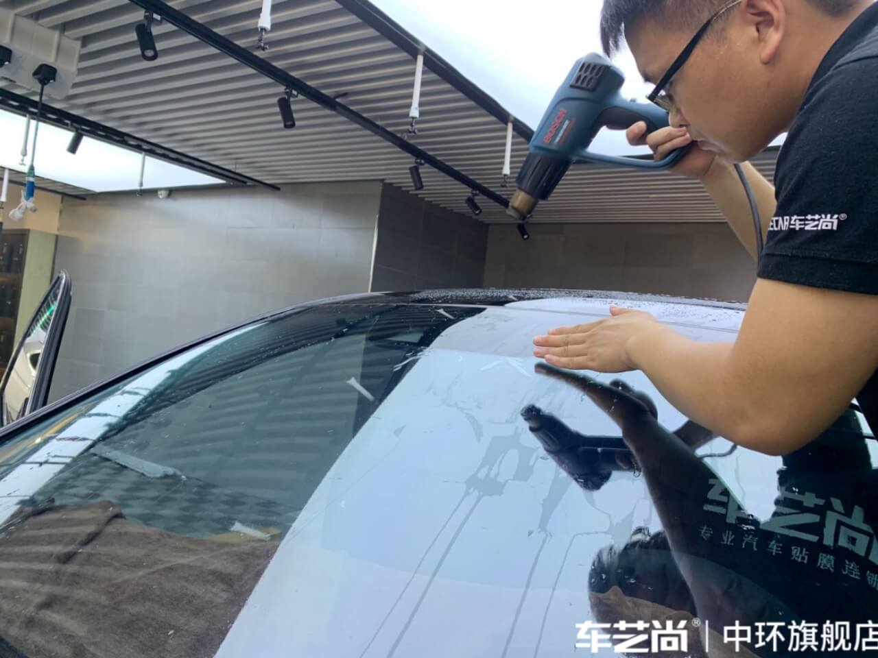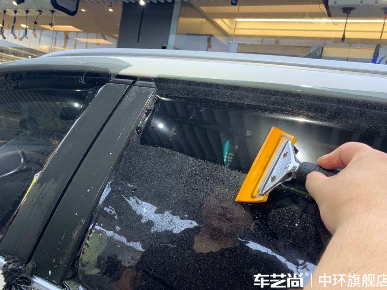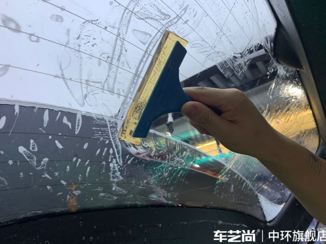 车艺尚技师不同施工部位采用不同的赶水手法与工具,确保膜与玻璃的充分贴合,无气泡、无翘边。