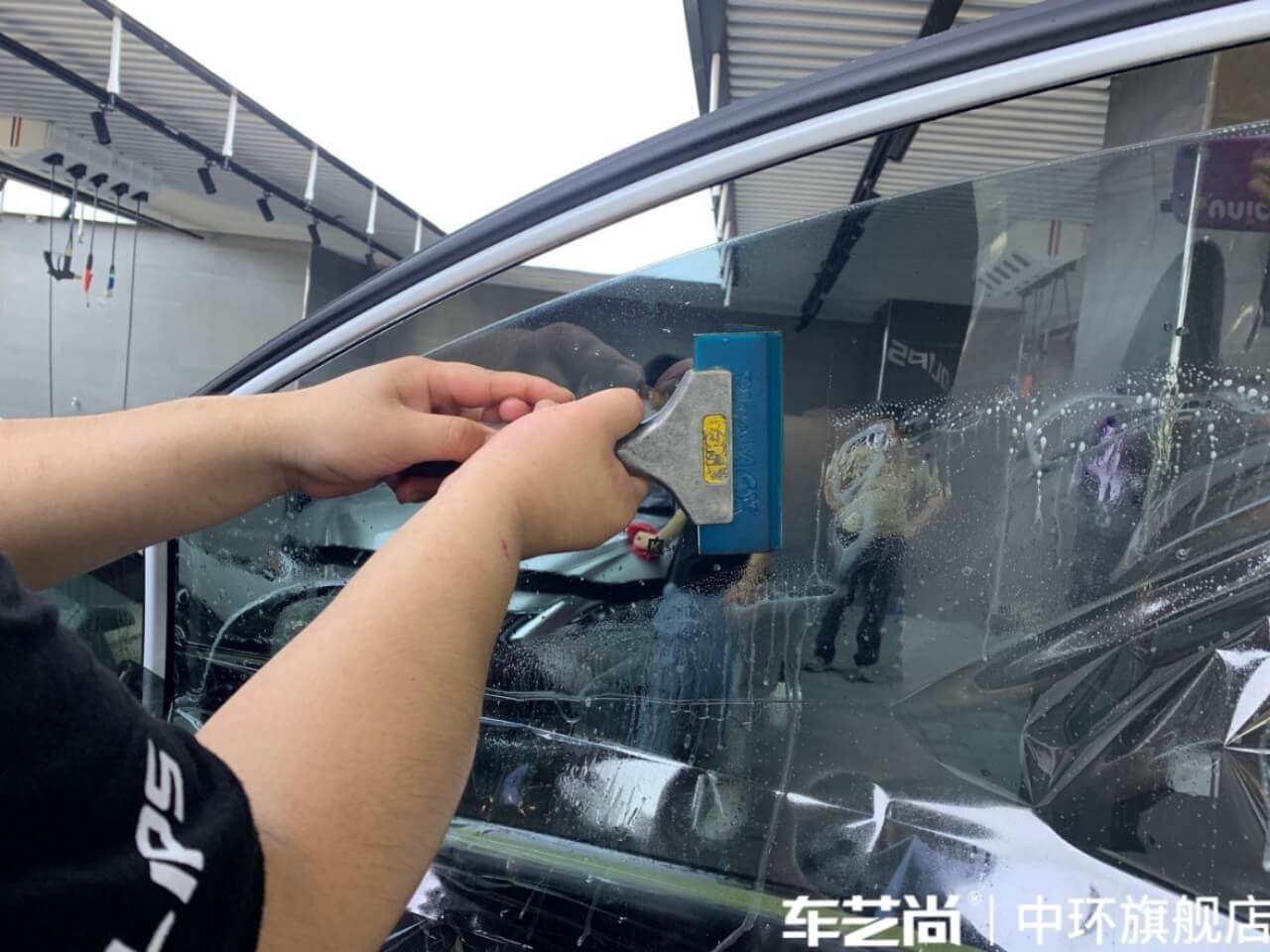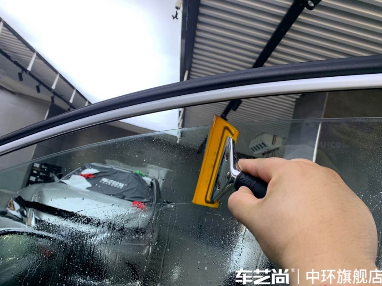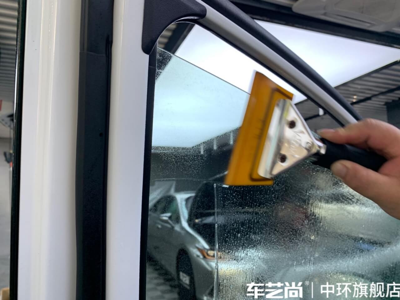 车艺尚技师不同施工部位采用不同的赶水手法与工具,确保膜与玻璃的充分贴合,无气泡、无翘边。