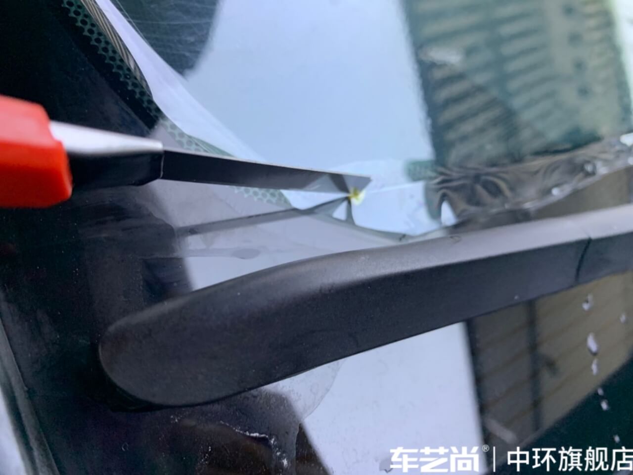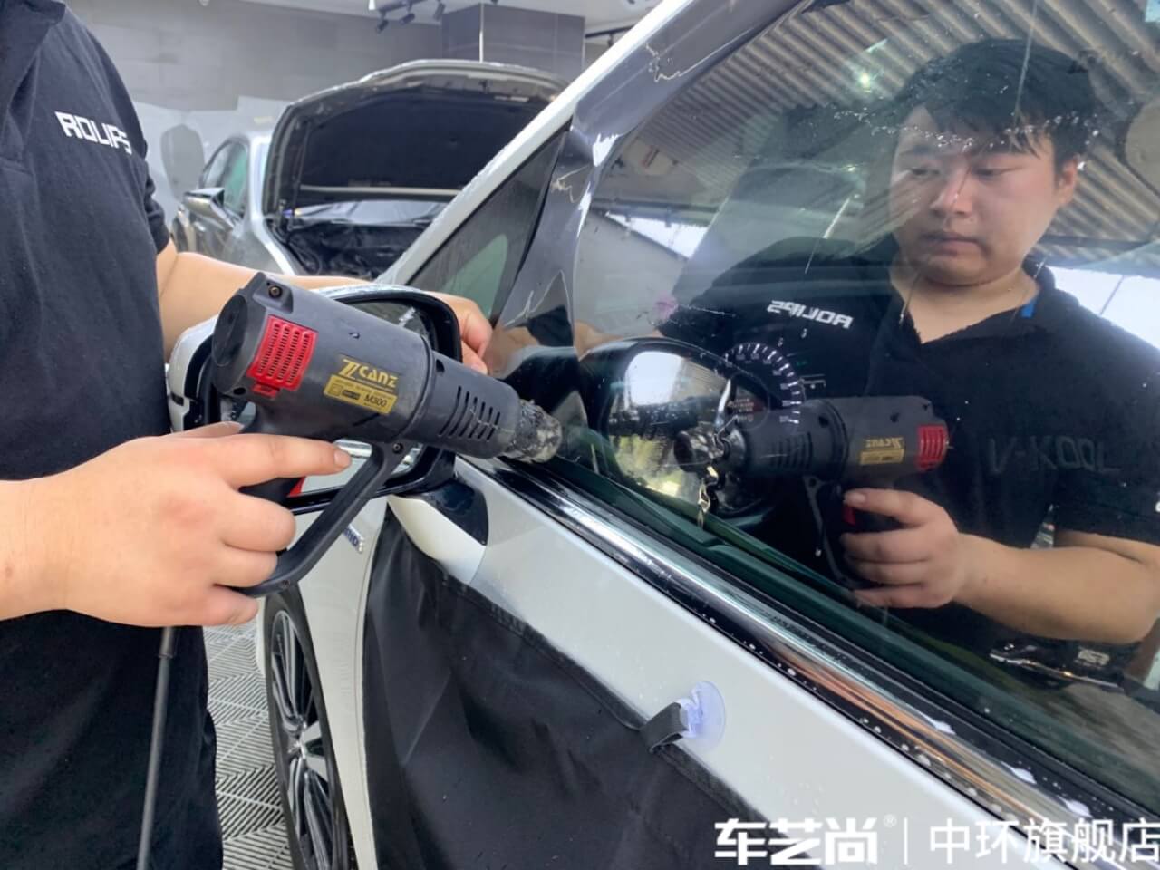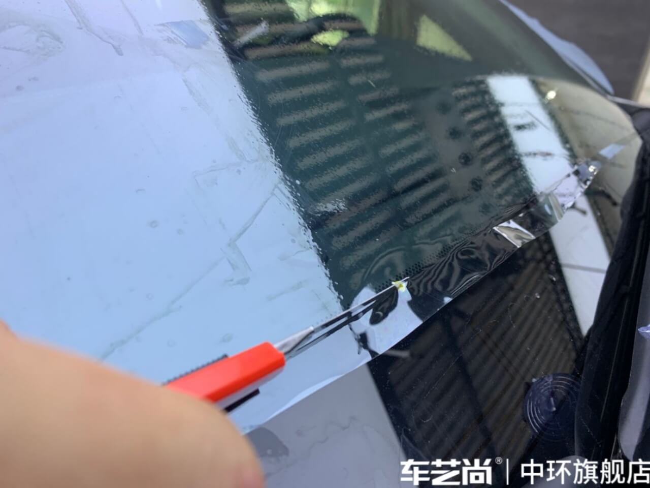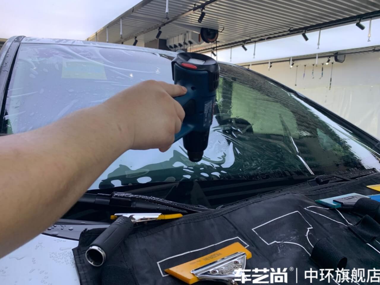 车艺尚技师不同施工部位采用不同的赶水手法与工具,确保膜与玻璃的充分贴合,无气泡、无翘边。