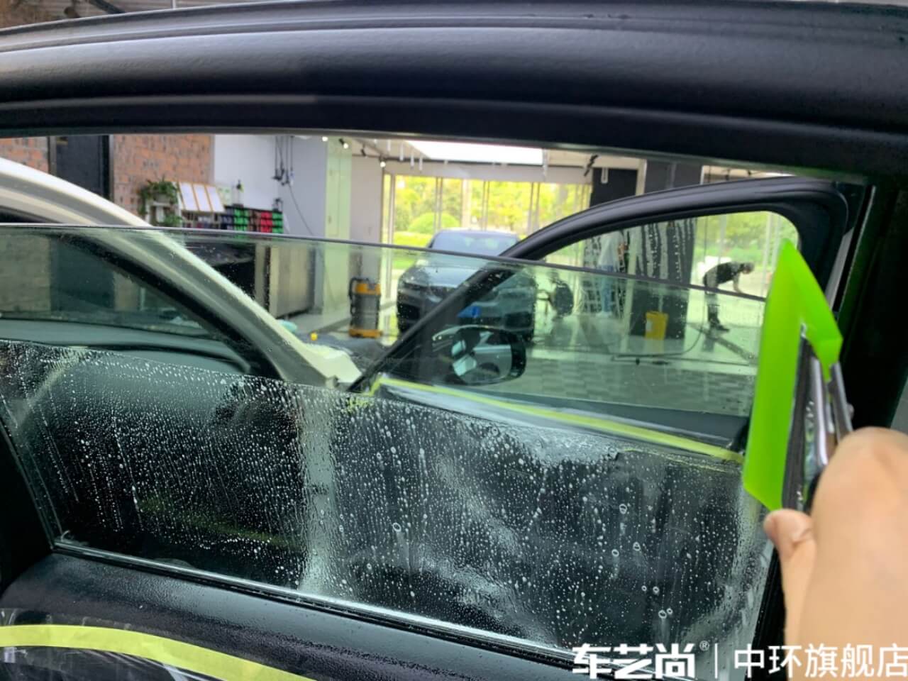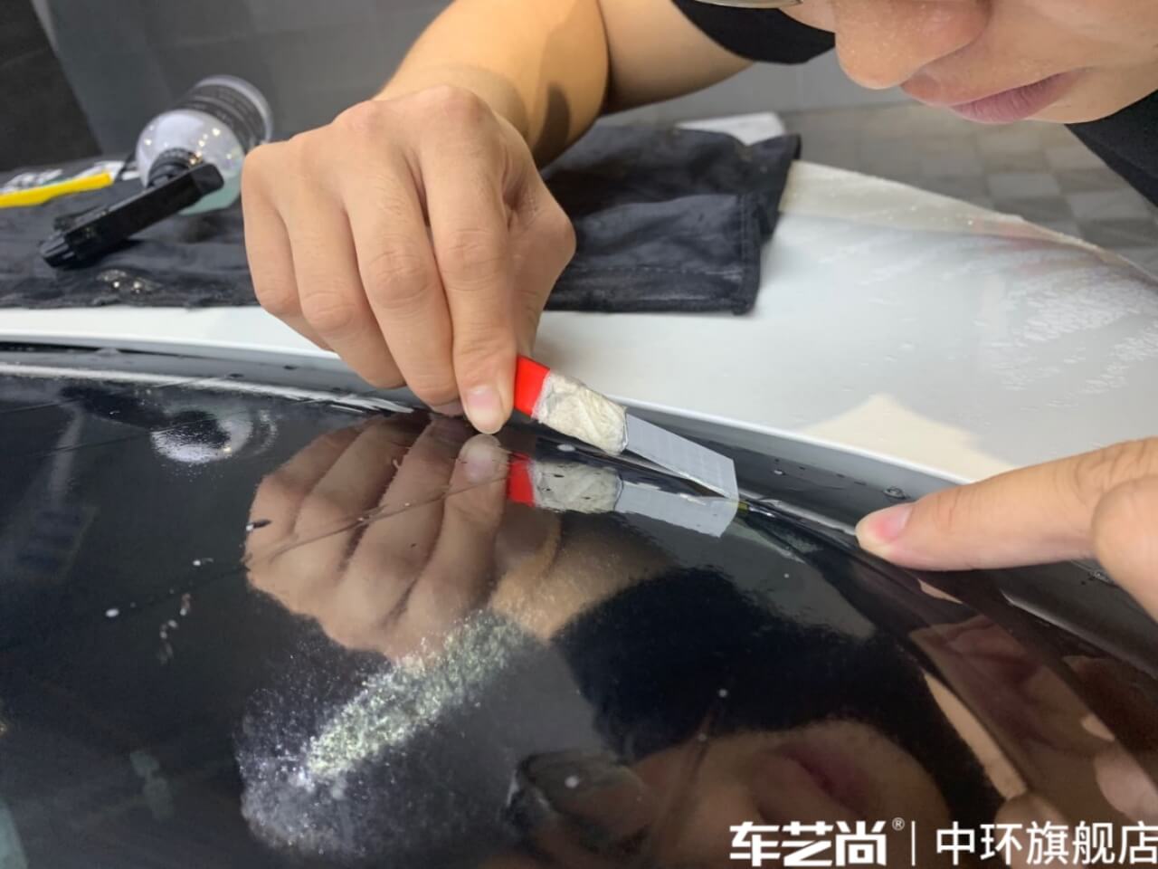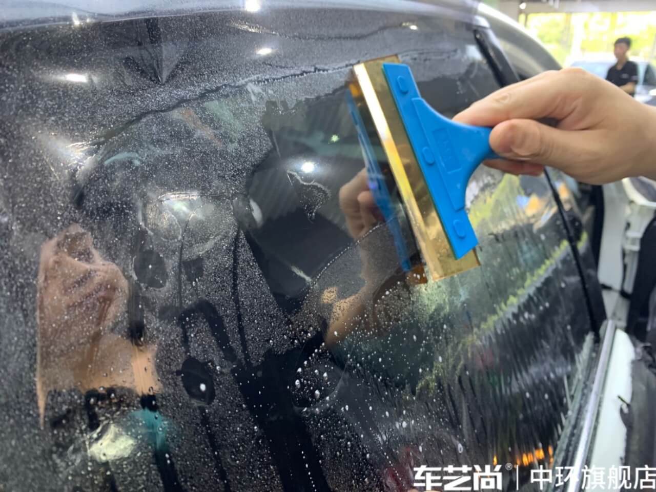 车艺尚技师不同施工部位采用不同的赶水手法与工具,确保膜与玻璃的充分贴合,无气泡、无翘边。
