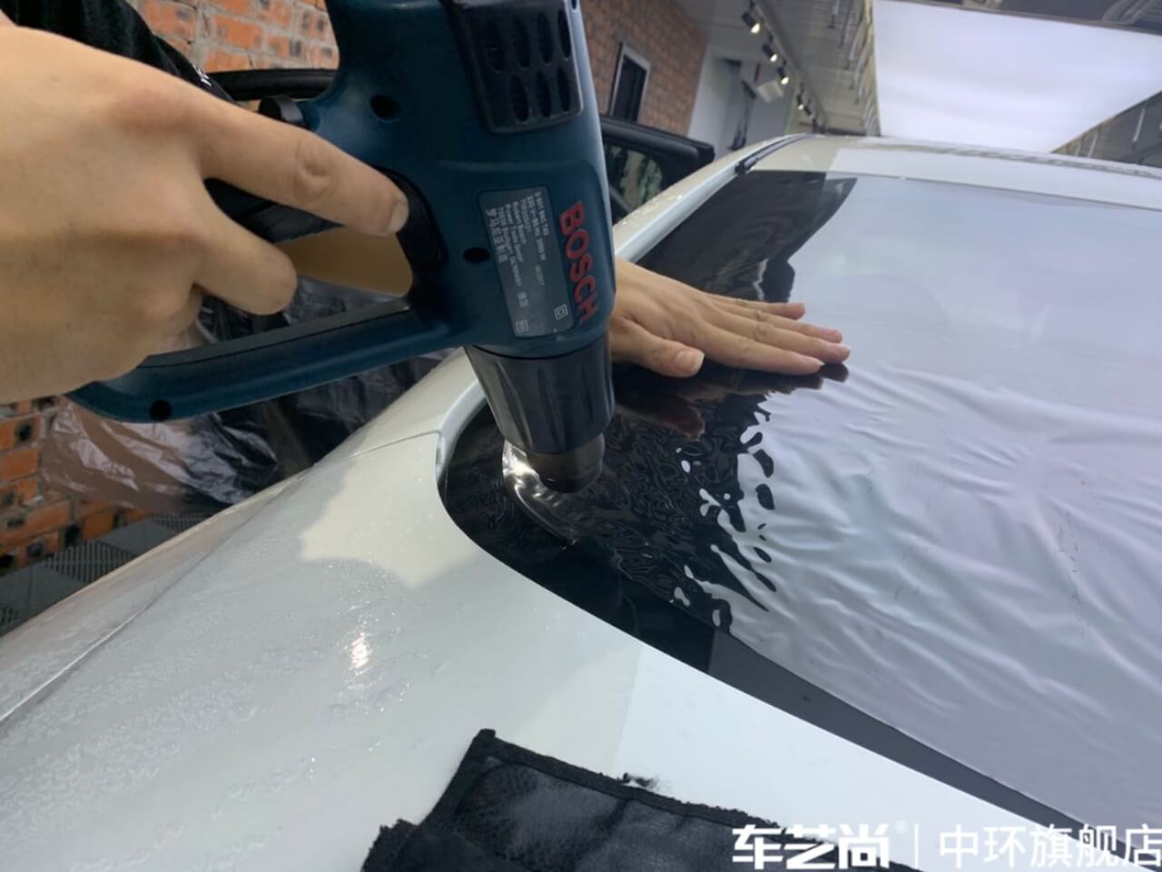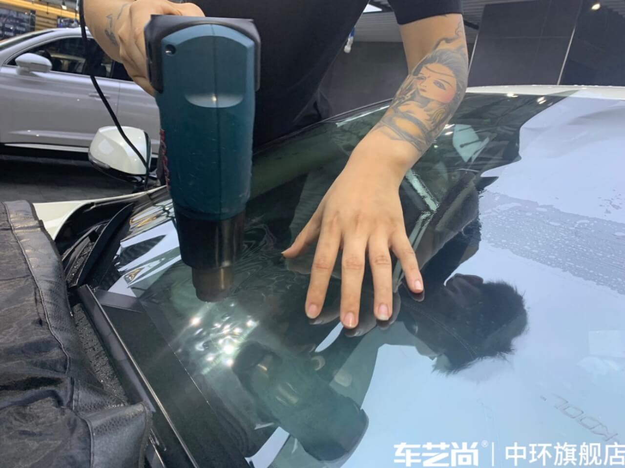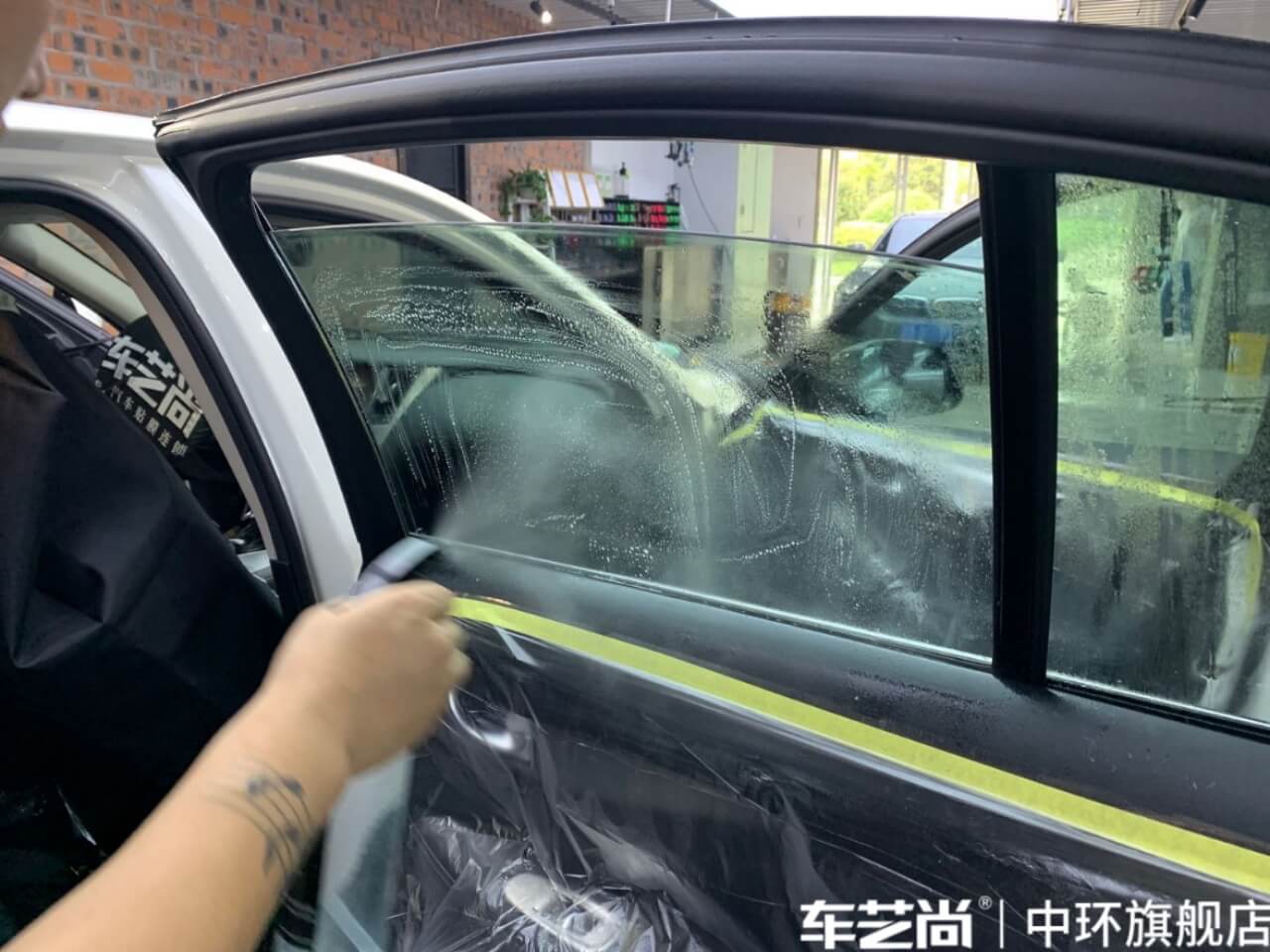 车艺尚技师不同施工部位采用不同的赶水手法与工具,确保膜与玻璃的充分贴合,无气泡、无翘边。