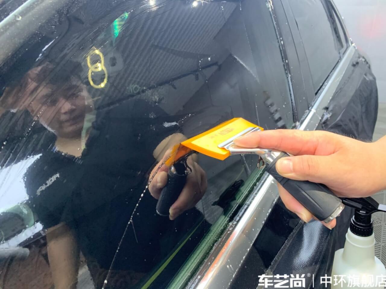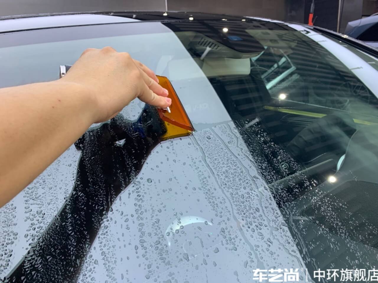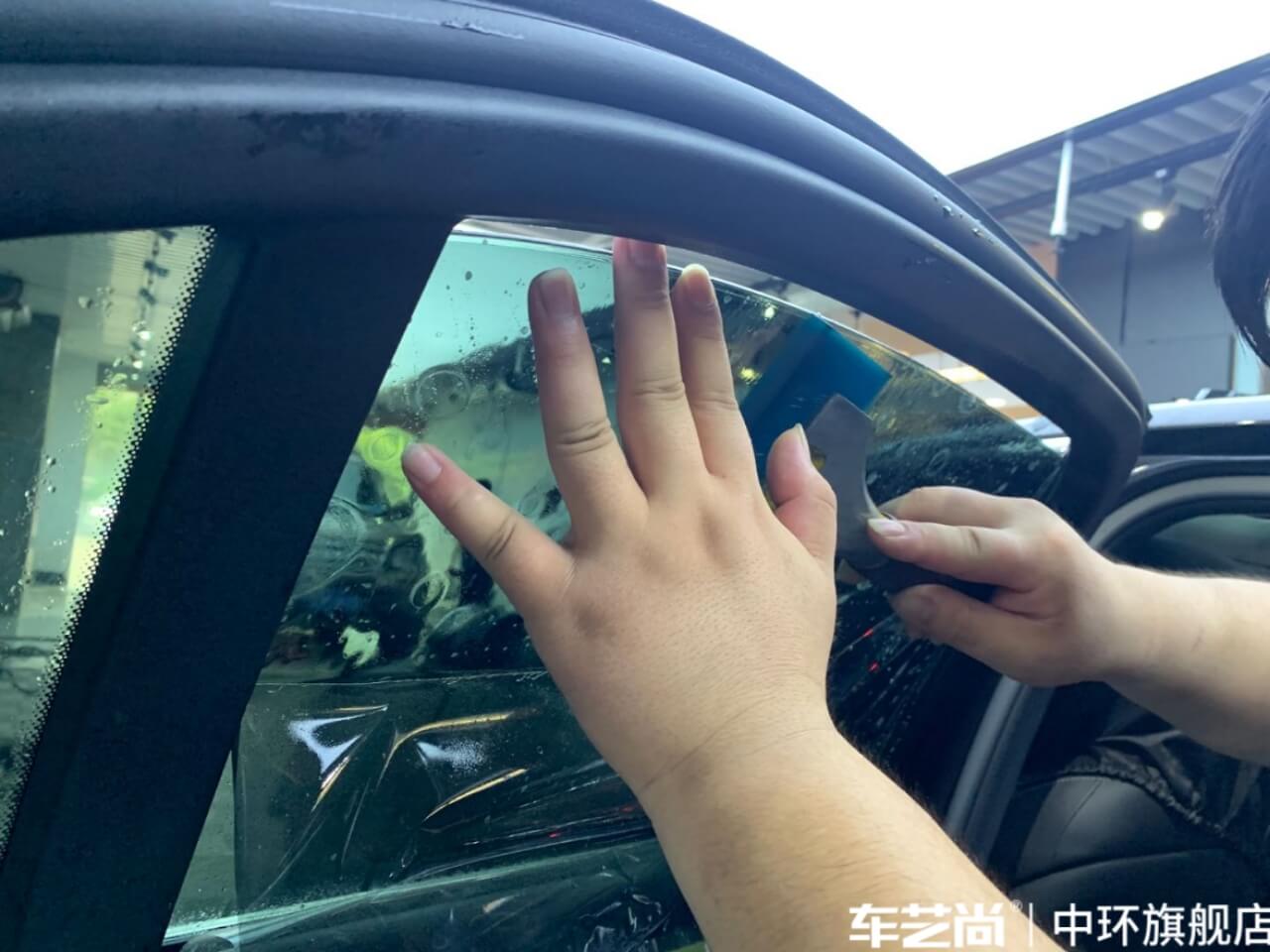 车艺尚技师不同施工部位采用不同的赶水手法与工具,确保膜与玻璃的充分贴合,无气泡、无翘边。