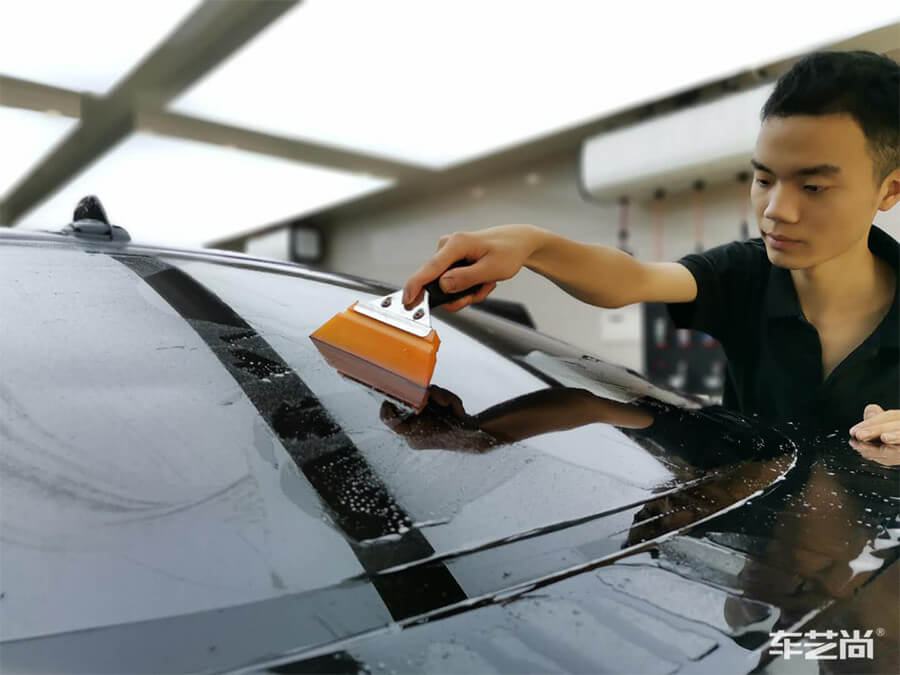 车艺尚技师不同施工部位采用不同的赶水手法与工具,确保膜与玻璃的充分贴合,无气泡、无翘边。