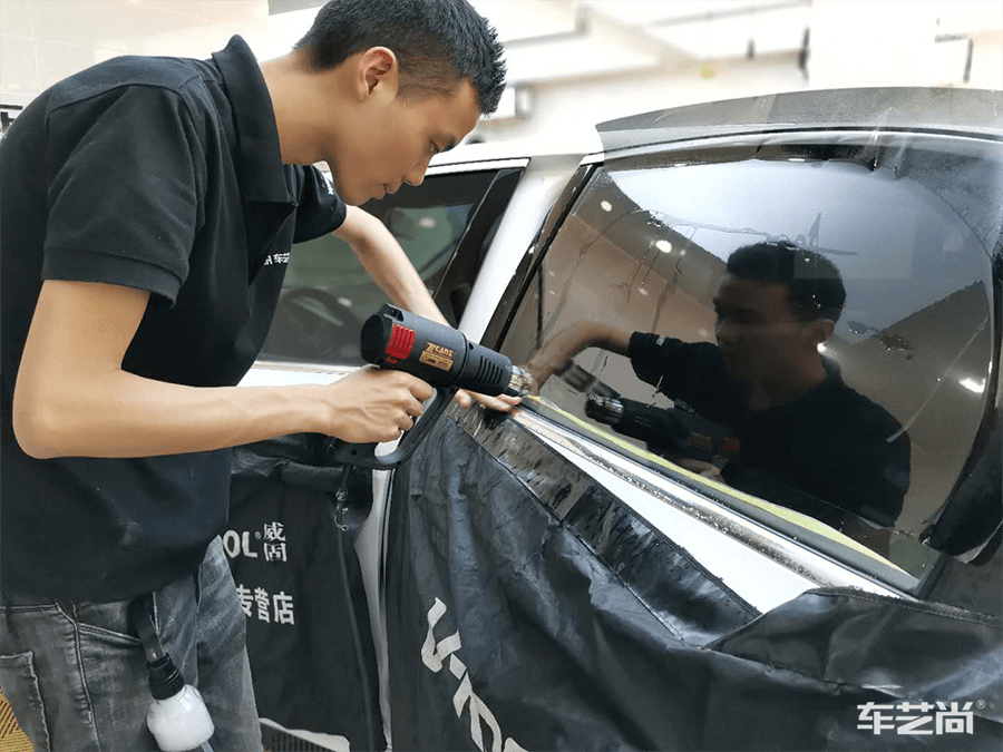 烘烤定型中,温度过高或过低都不行,这就既需要恒温的烤枪,又需要技师的手法,烘烤的距离、时长,都影响着膜的延展度。不专业的烘烤操作很容易烤伤车膜,甚至是爱车的玻璃。