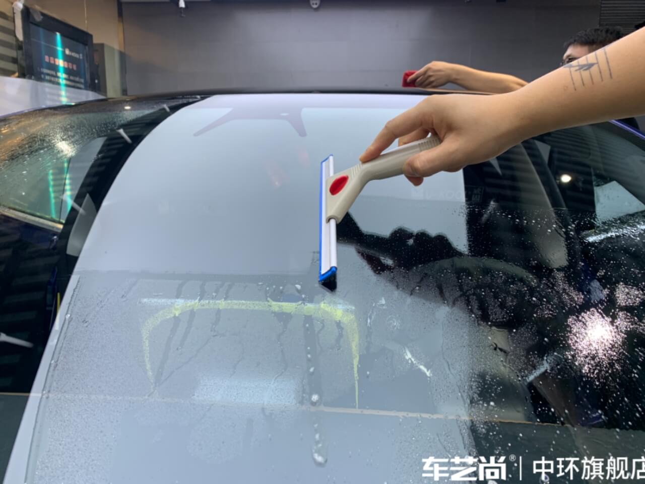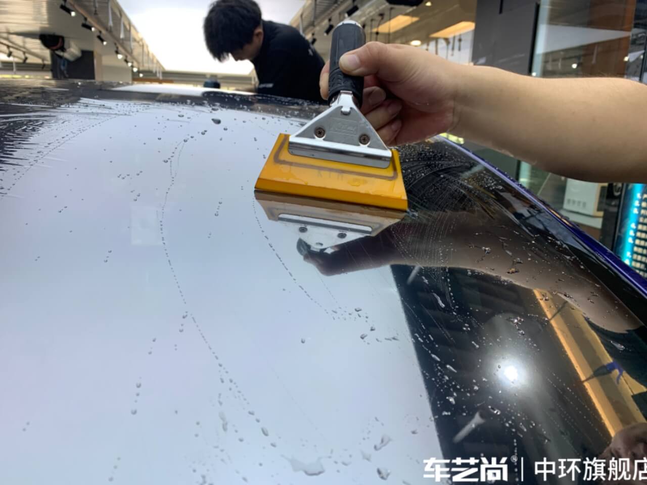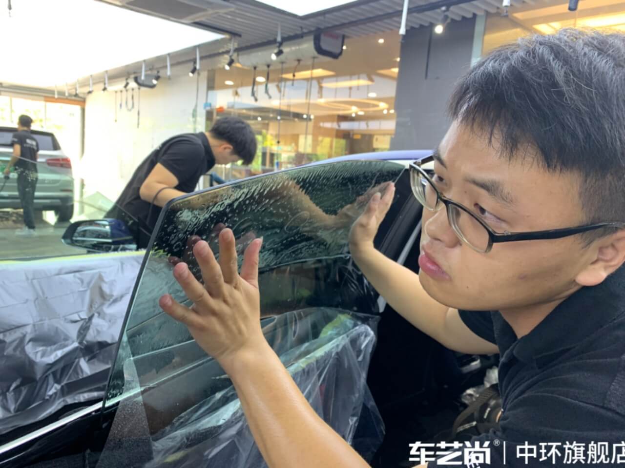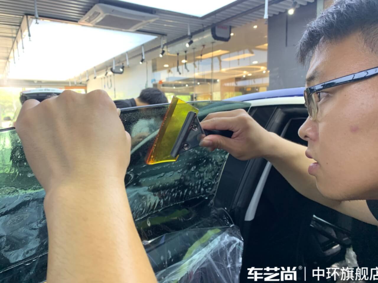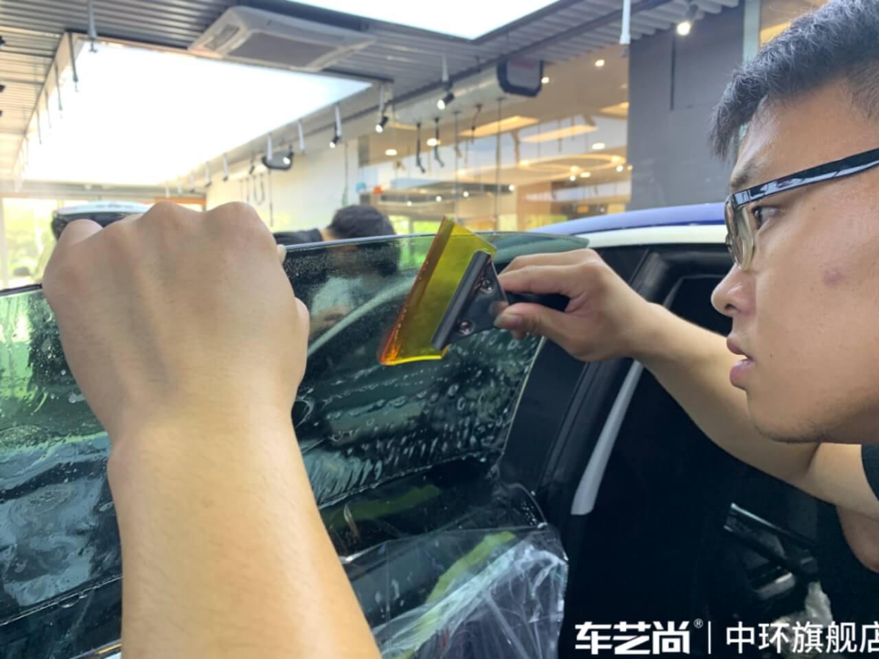 车艺尚技师不同施工部位采用不同的赶水手法与工具,确保膜与玻璃的充分贴合,无气泡、无翘边。