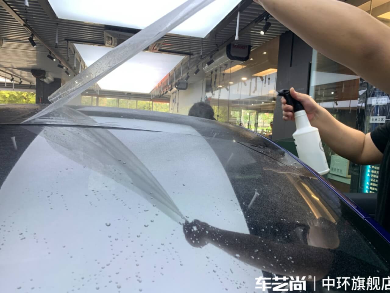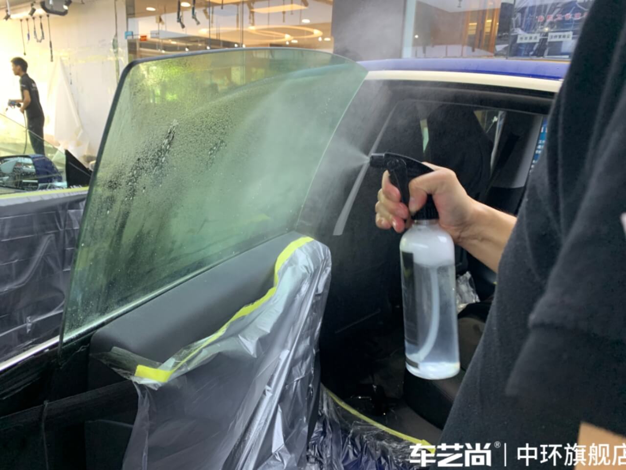 车艺尚贴膜技师在施工中采用500ML微水施工(市面上一般采用3000ML,甚至更大的用水量),避免因为用水过多对内饰、仪表盘、真皮座椅、电路系统等引起受潮发霉或短路危险。