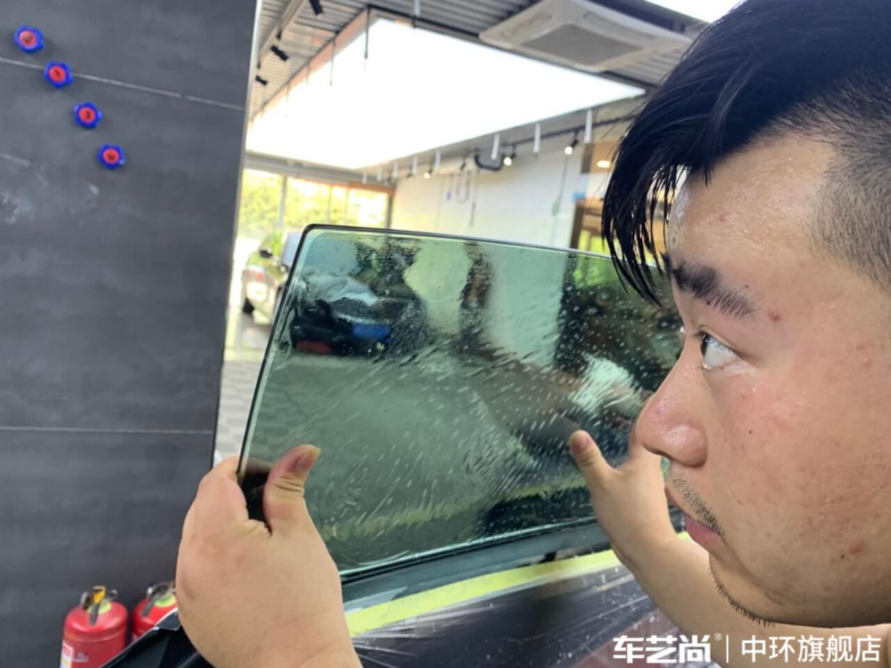 车艺尚技师不同施工部位采用不同的赶水手法与工具,确保膜与玻璃的充分贴合,无气泡、无翘边。