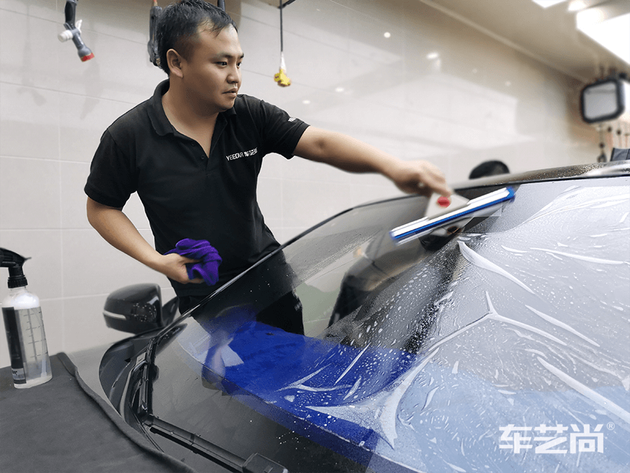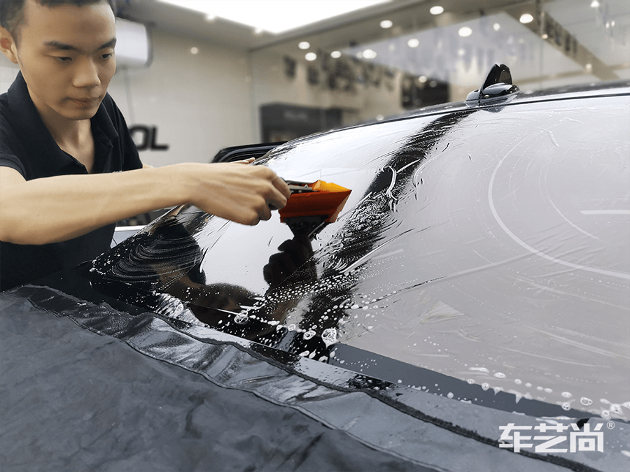 车艺尚技师不同施工部位采用不同的赶水手法与工具,确保膜与玻璃的充分贴合,无气泡、无翘边。