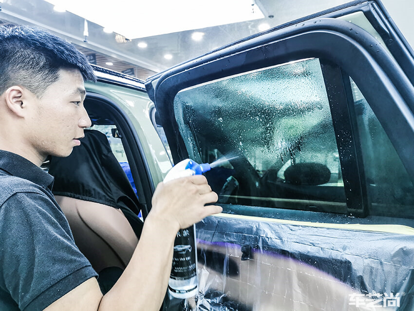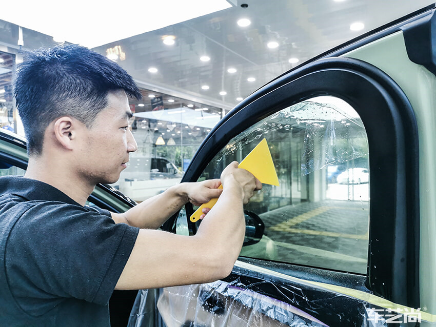 车艺尚技师不同施工部位采用不同的赶水手法与工具,确保膜与玻璃的充分贴合,无气泡、无翘边。