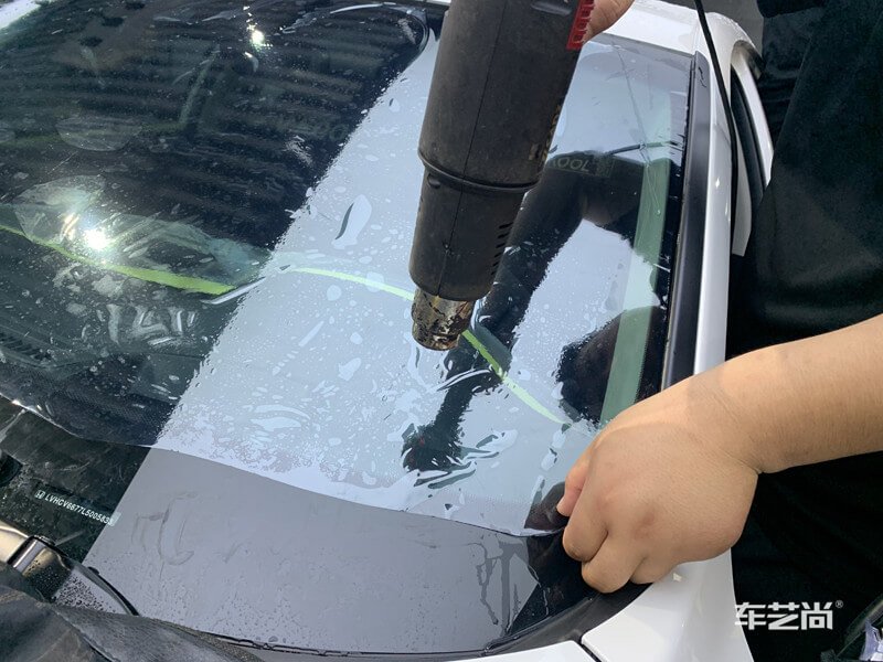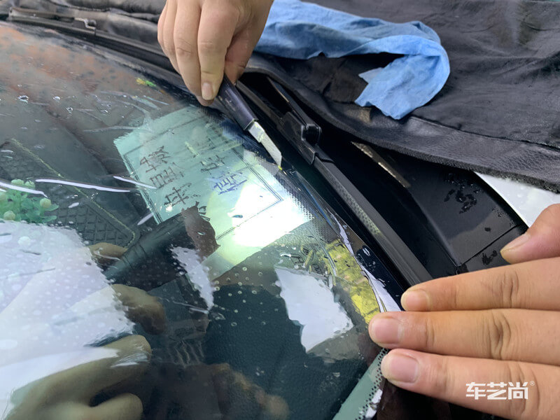 车艺尚技师不同施工部位采用不同的赶水手法与工具,确保膜与玻璃的充分贴合,无气泡、无翘边。