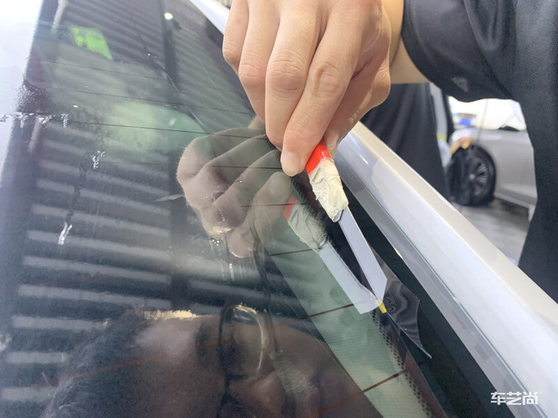 车艺尚技师不同施工部位采用不同的赶水手法与工具,确保膜与玻璃的充分贴合,无气泡、无翘边。