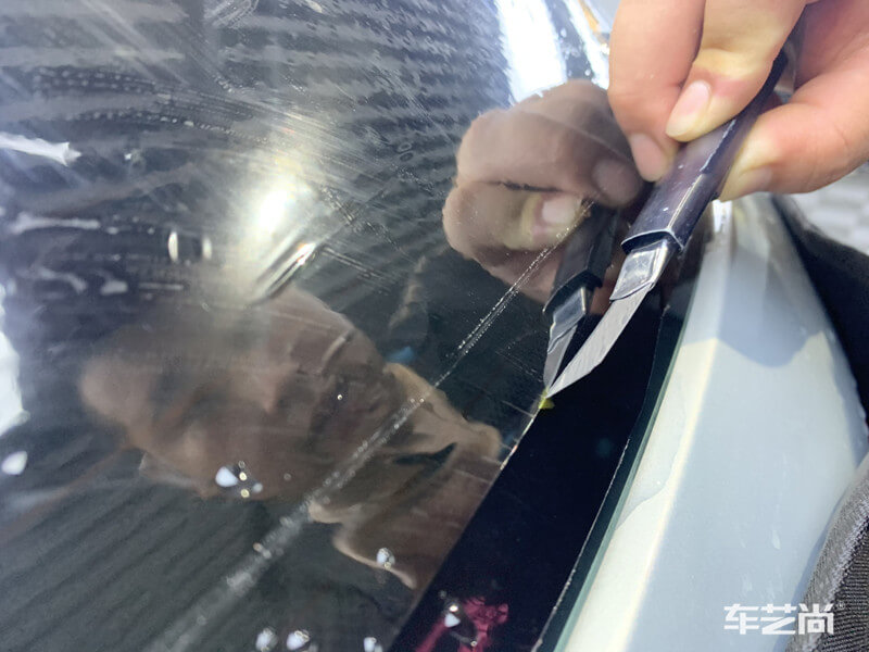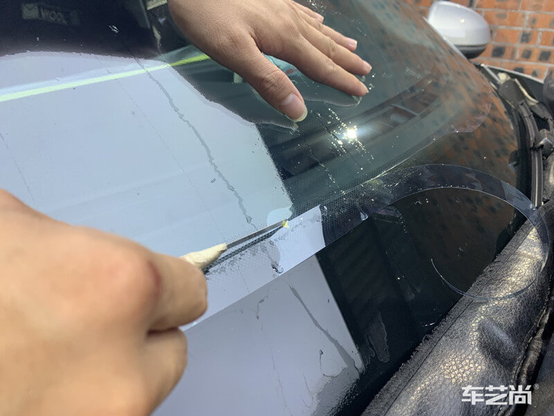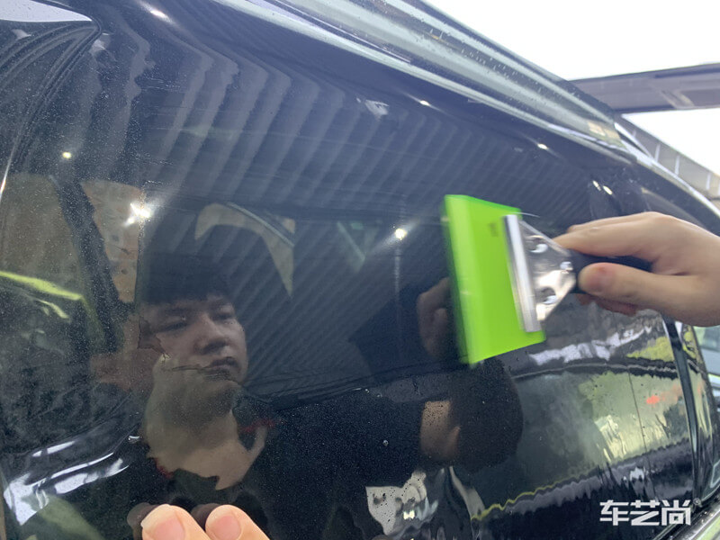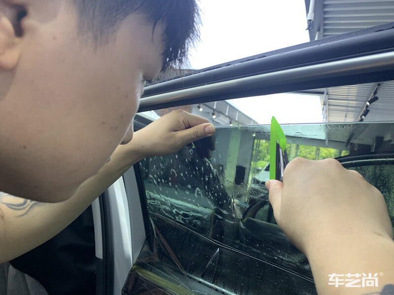 车艺尚技师不同施工部位采用不同的赶水手法与工具,确保膜与玻璃的充分贴合,无气泡、无翘边。