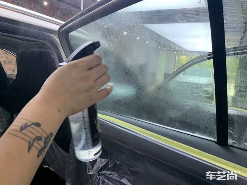 车艺尚贴膜技师在施工中采用500ML微水施工(市面上一般采用3000ML,甚至更大的用水量),避免因为用水过多对内饰、仪表盘、真皮座椅、电路系统等引起受潮发霉或短路危险。