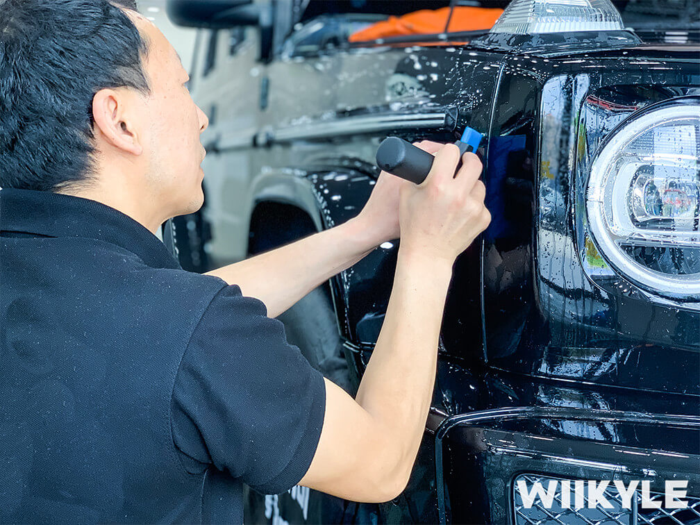刮板除水,专用的刮板工具进行除水,刮出多余的水和气泡,使车衣和车身更加黏合。