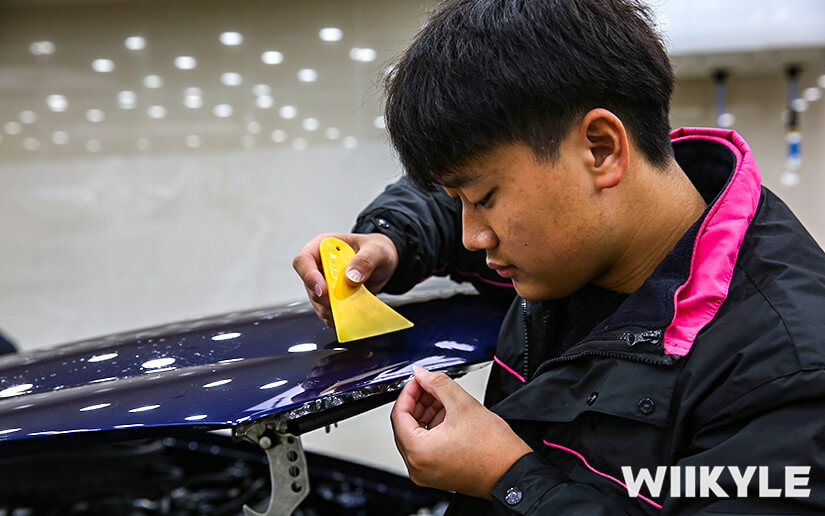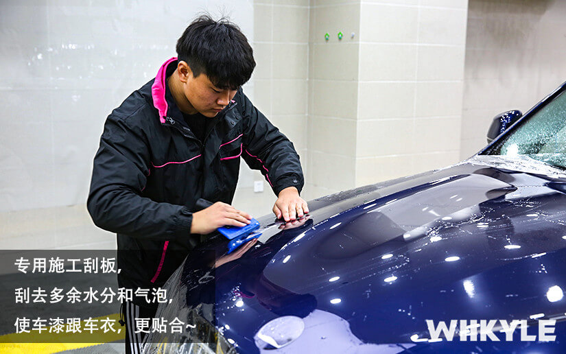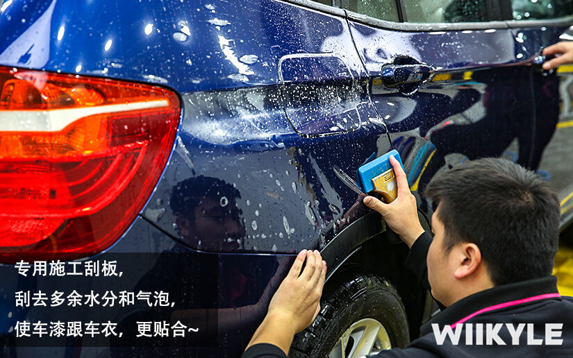 使用专业的刮板工具,刮出车衣与车身之间多余的水和气泡,让其更加黏合。