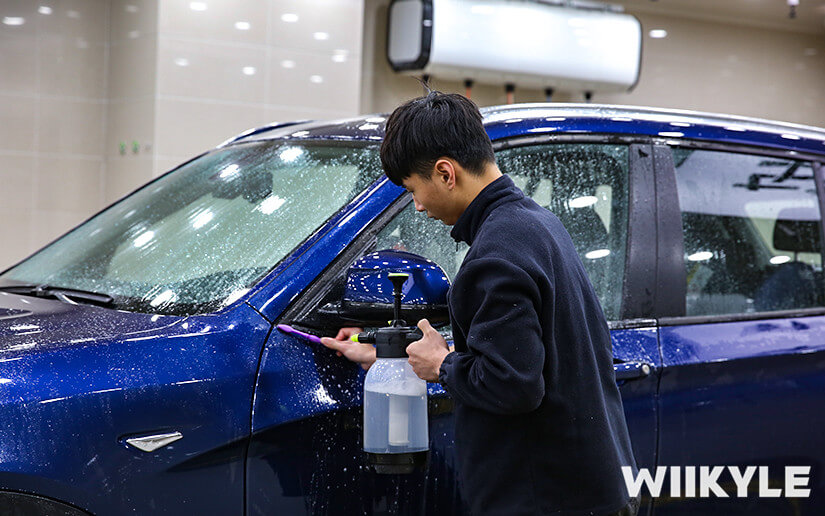 贴膜前使用火山泥对车身进行深度清洁,清洁车身表面的污物。