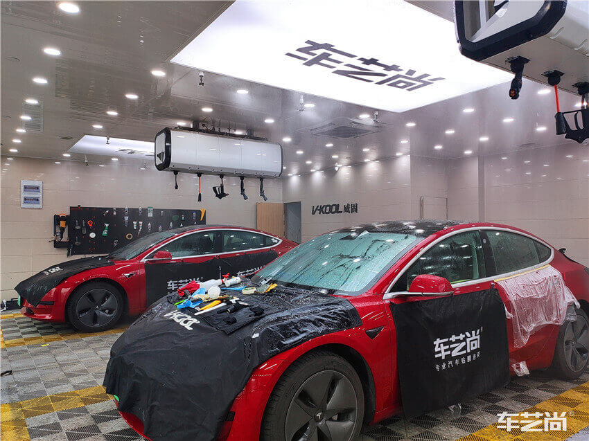 车艺尚配备大型喷淋除尘系统,施工前雾化空气,模拟雨天的空气湿度,可以达到理想的贴膜环境。
