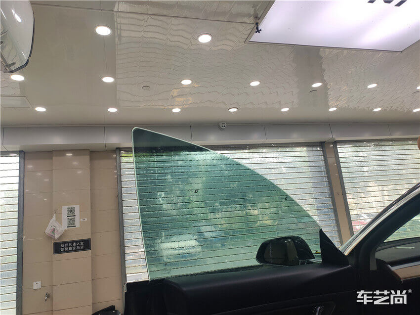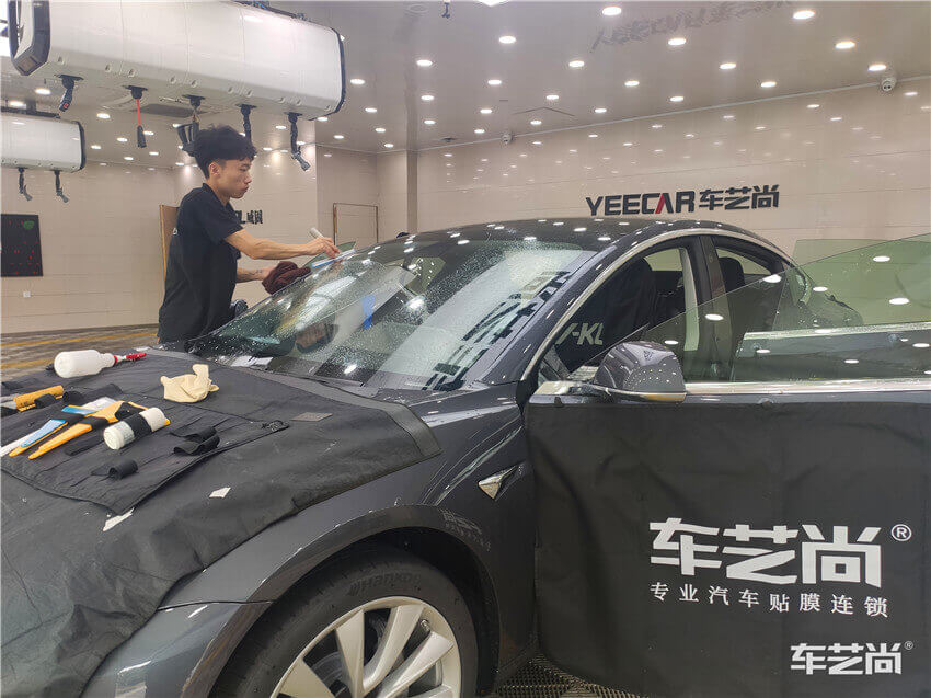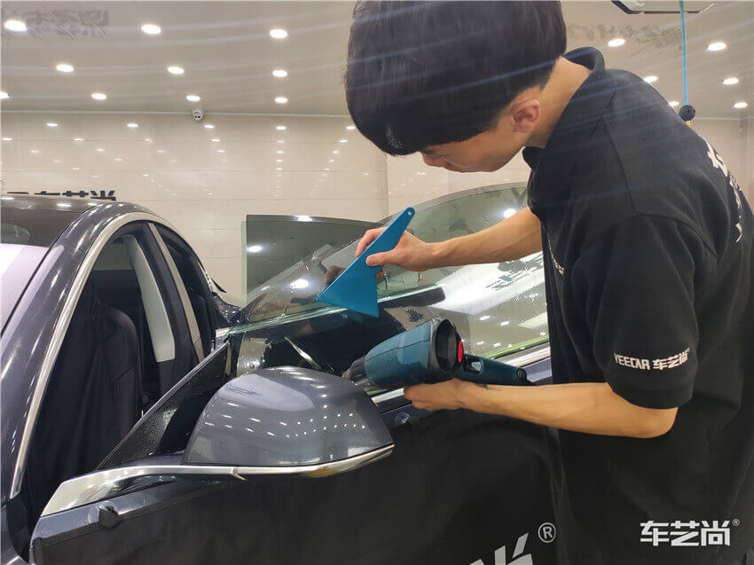 车艺尚技师不同施工部位采用不同的赶水手法与工具,确保膜与玻璃的充分贴合,无气泡、无翘边。