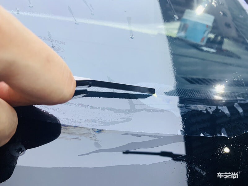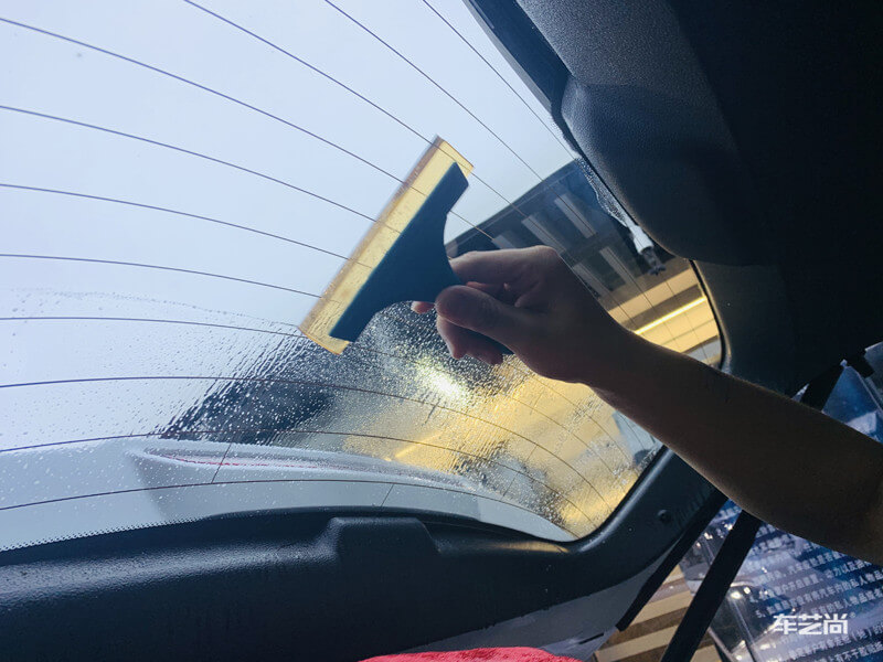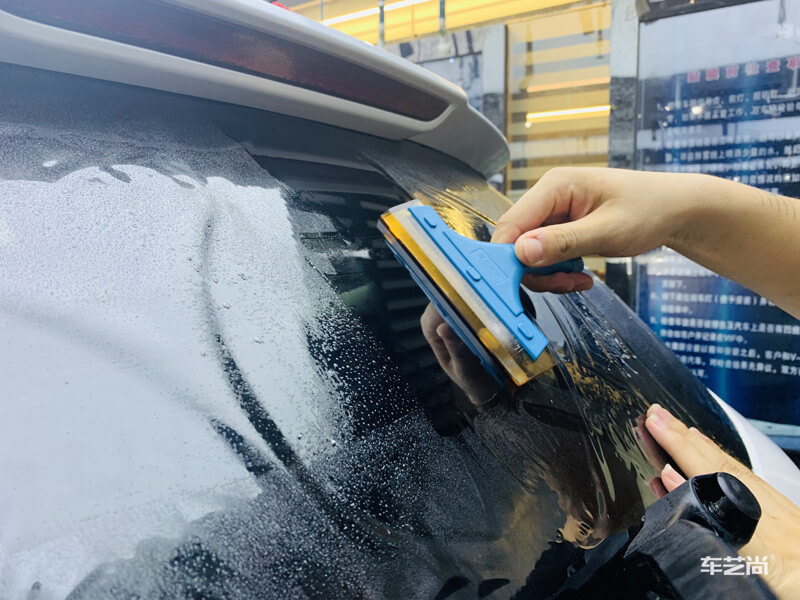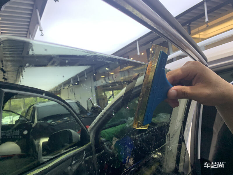 车艺尚技师不同施工部位采用不同的赶水手法与工具,确保膜与玻璃的充分贴合,无气泡、无翘边。