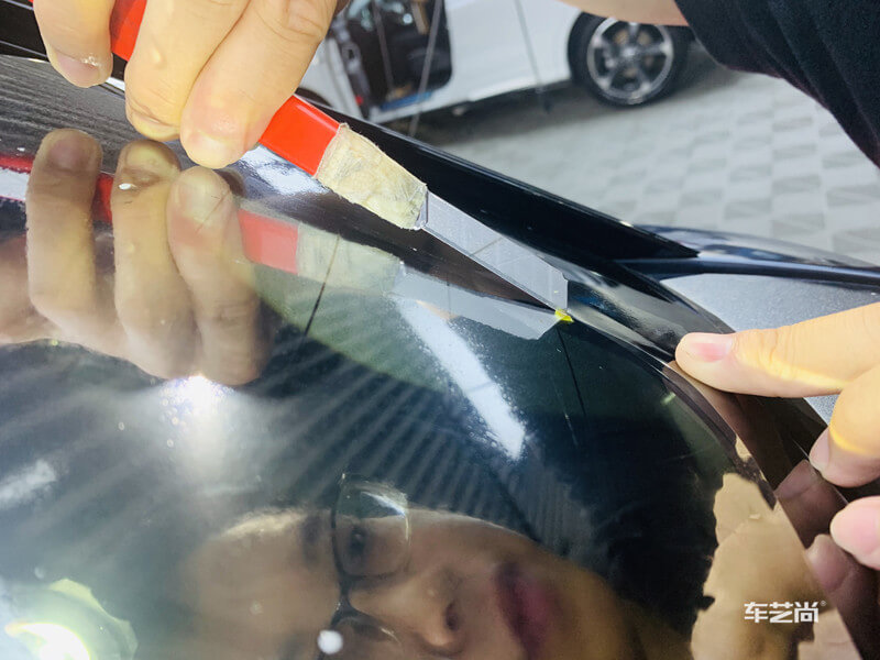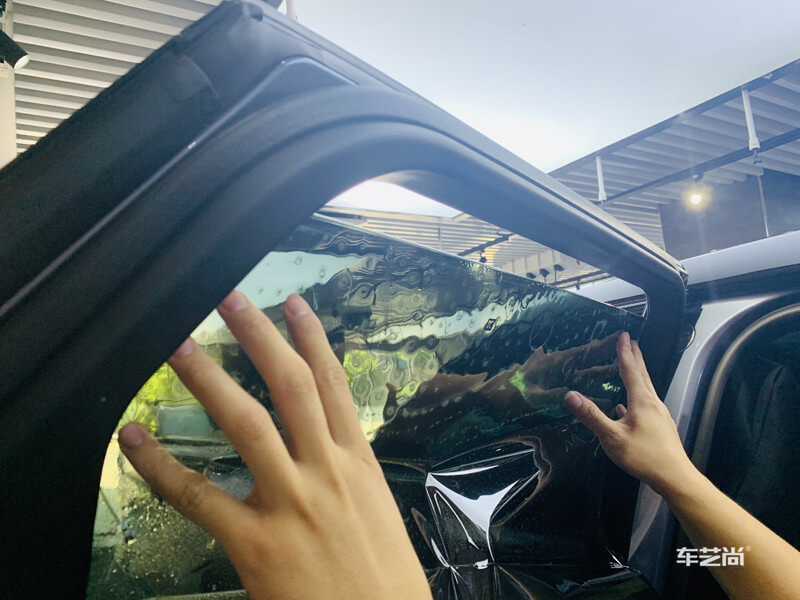车艺尚技师不同施工部位采用不同的赶水手法与工具,确保膜与玻璃的充分贴合,无气泡、无翘边。