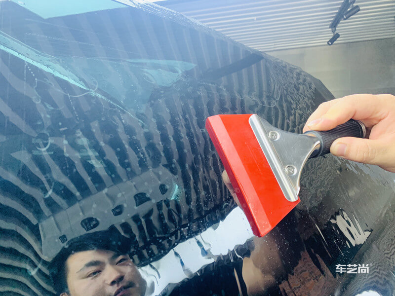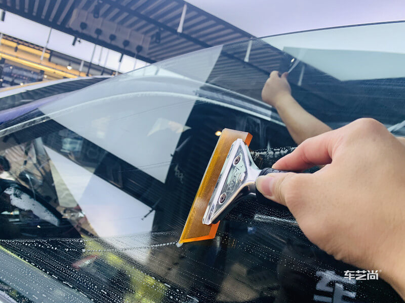 车艺尚技师不同施工部位采用不同的赶水手法与工具,确保膜与玻璃的充分贴合,无气泡、无翘边。