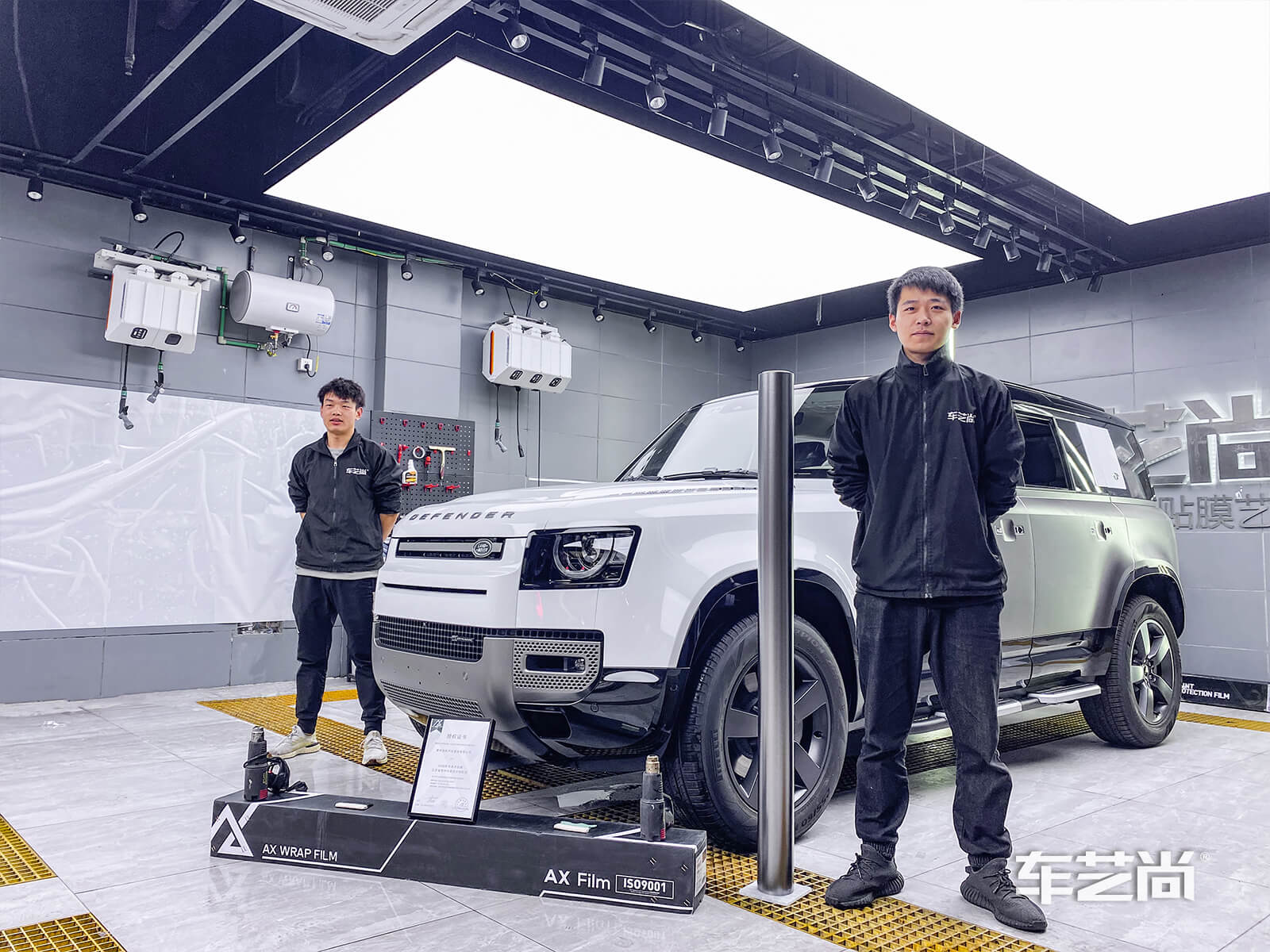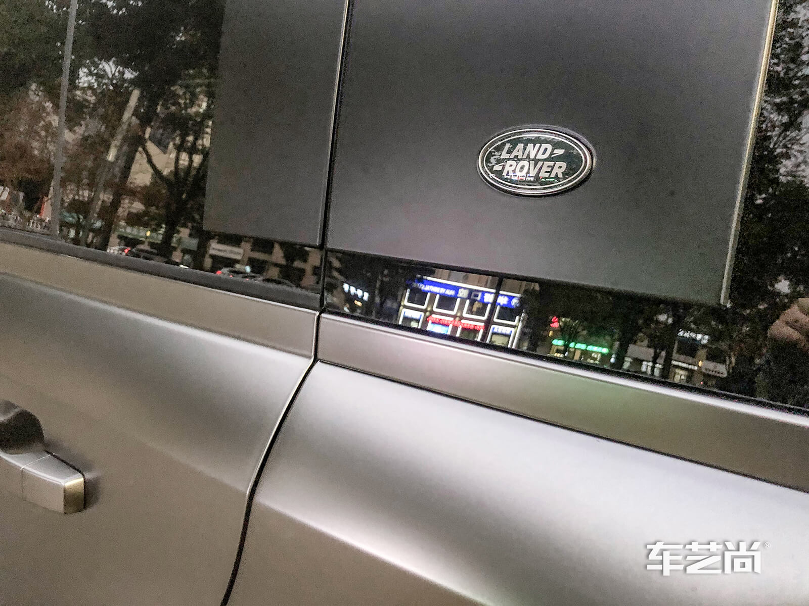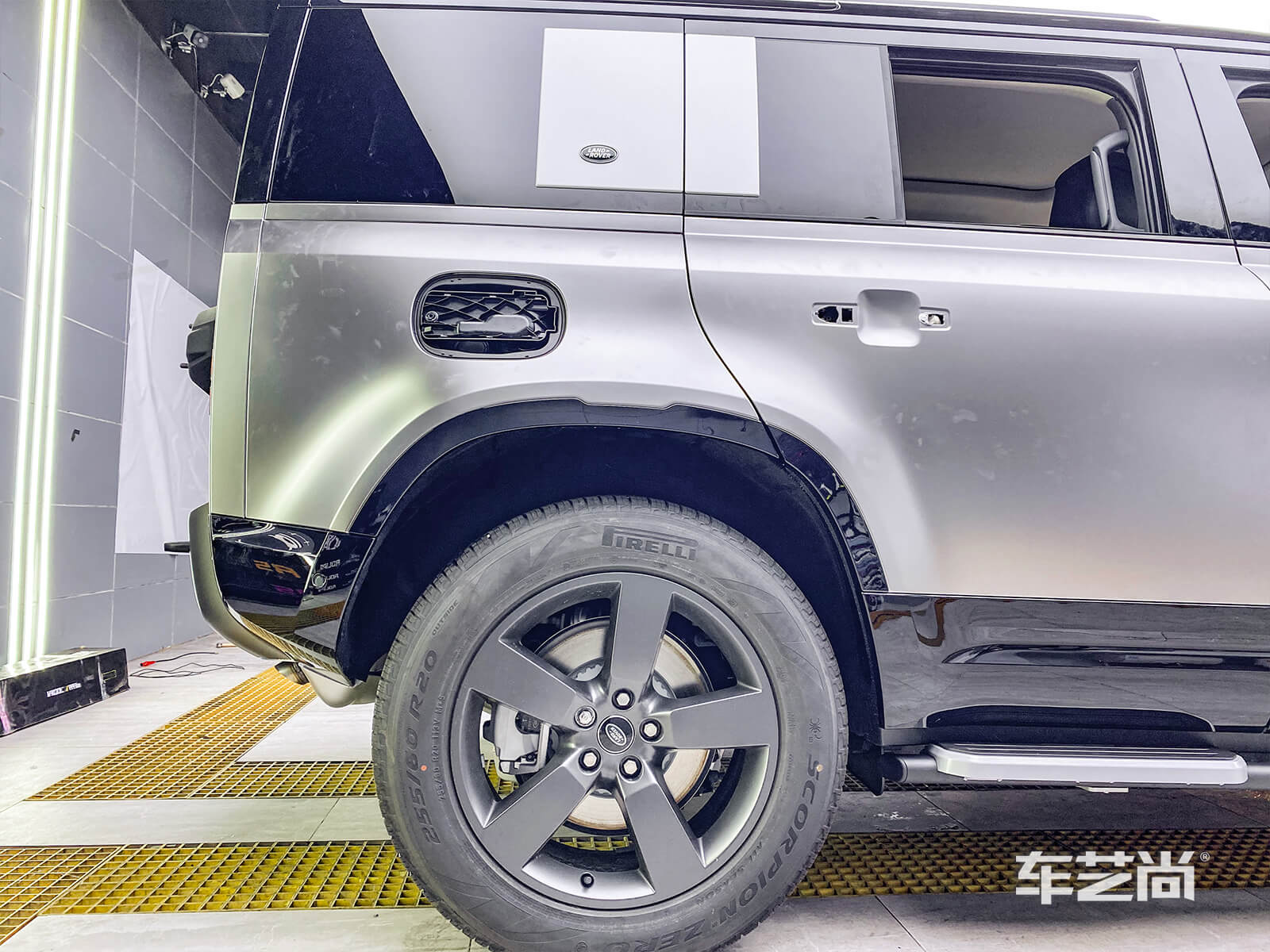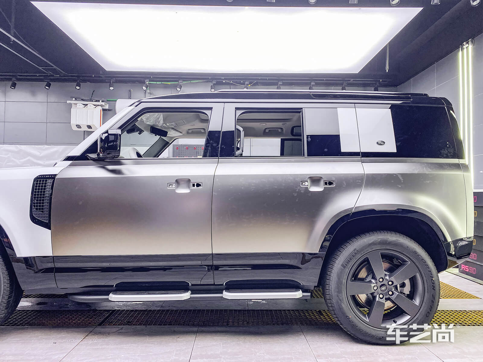 路虎卫士白色施工AX改色膜亚面液态金属银+亚黑效果: