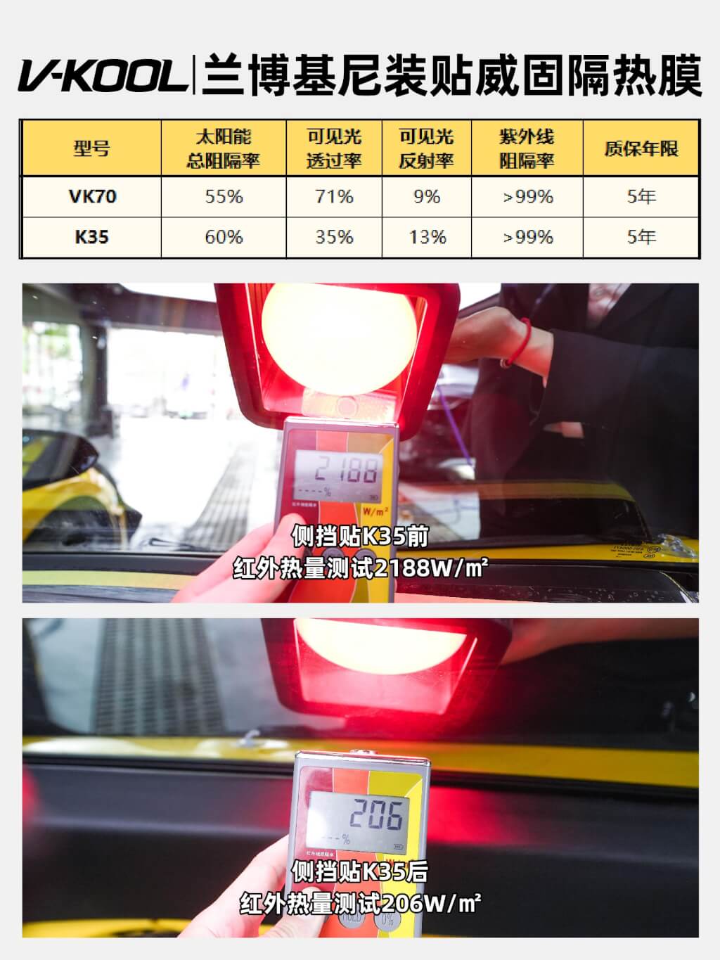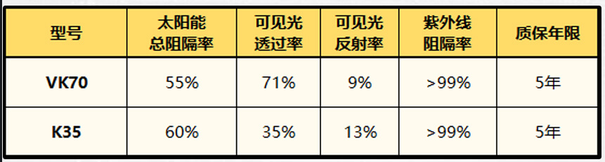 VK70是人们最常贴的威固前档车膜,也是威固最热门的车膜型号,主打的是高隔热,高透光,提供超高清晰驾驶视野,减少视觉疲劳。被誉为“隔热清晰双冠王”,将隔热性能和清晰视野做到完美结合。前档VK70+侧后K35/ K15是人们常用的威固车膜组合,其中K35是威固中隐私侧后档窗膜,透明度比较高,适合喜欢良好光线的车友使用。