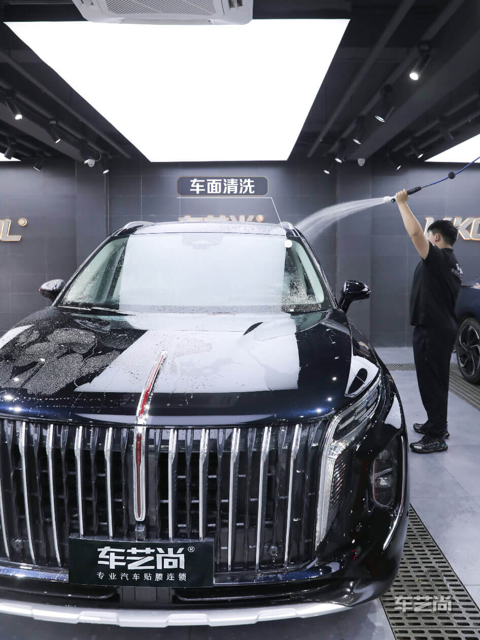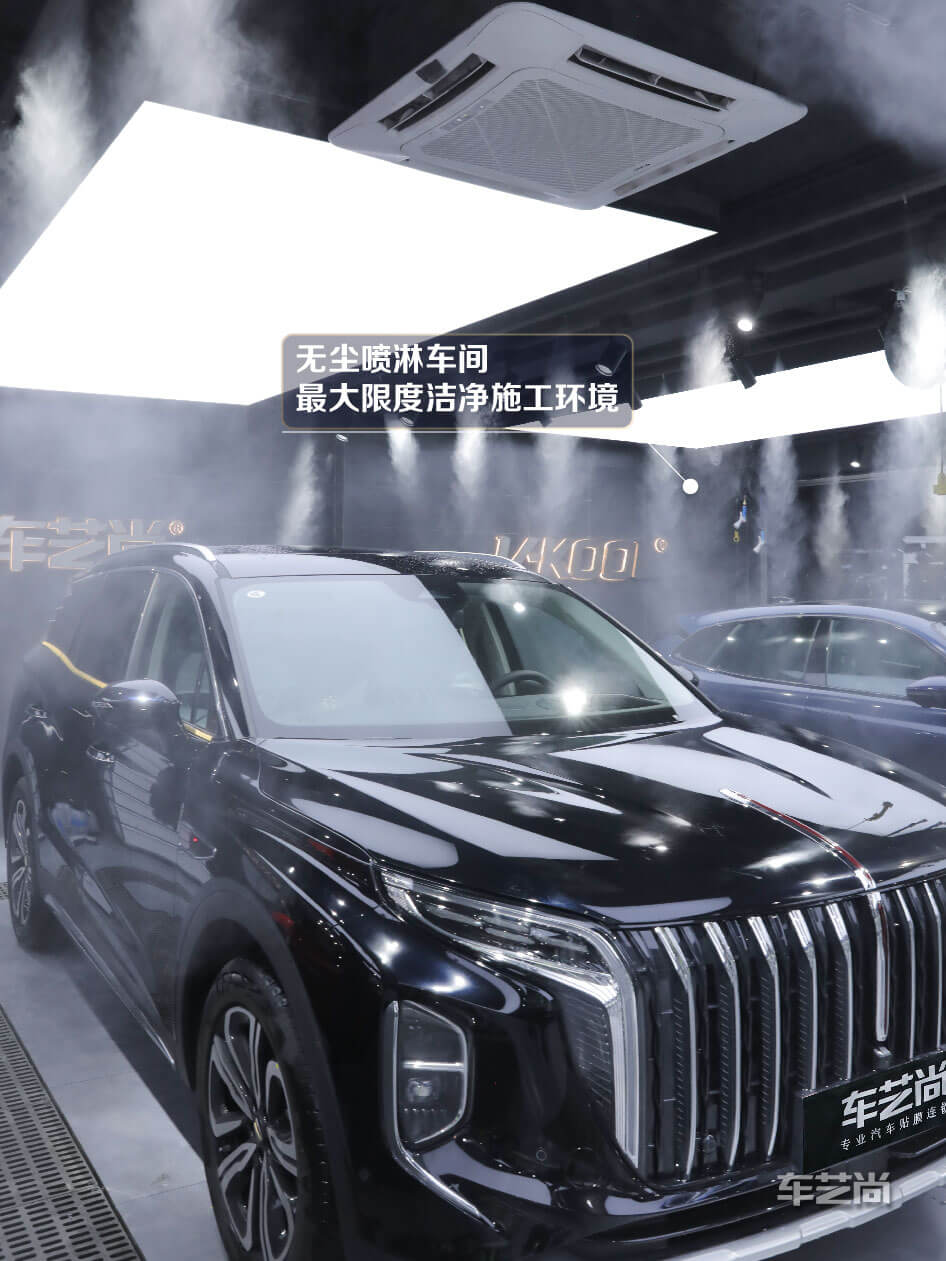 车艺尚御水路店配备有专业照明系统和大型喷淋除尘设备,以及标准的车间疏水系统,可以最大限度降低空气中的悬浮颗粒,减少尘点附着。施工环境干净、明亮、整洁,全程无尘施工,保障施工品质。