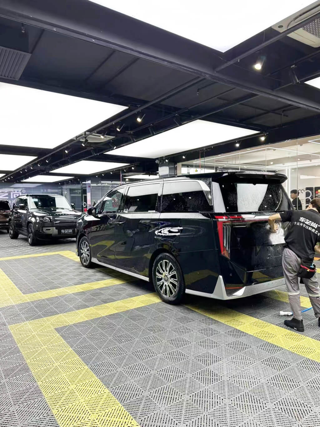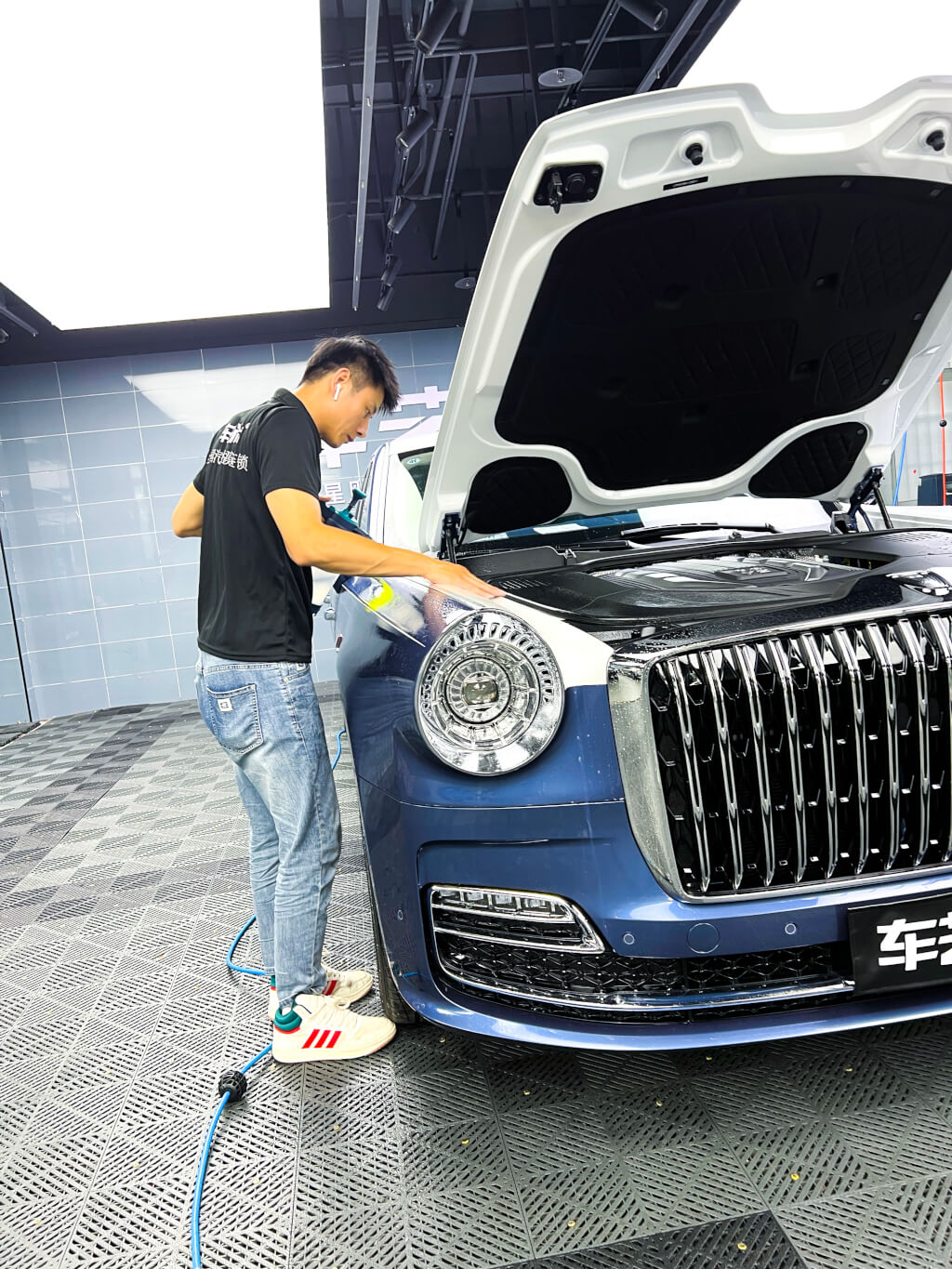 车艺尚前海店配备有专业照明系统和大型喷淋除尘设备,以及标准的车间疏水系统,可以最大限度降低空气中的悬浮颗粒,减少尘点附着。施工环境干净、明亮、整洁,全程无尘施工,保障施工品质。