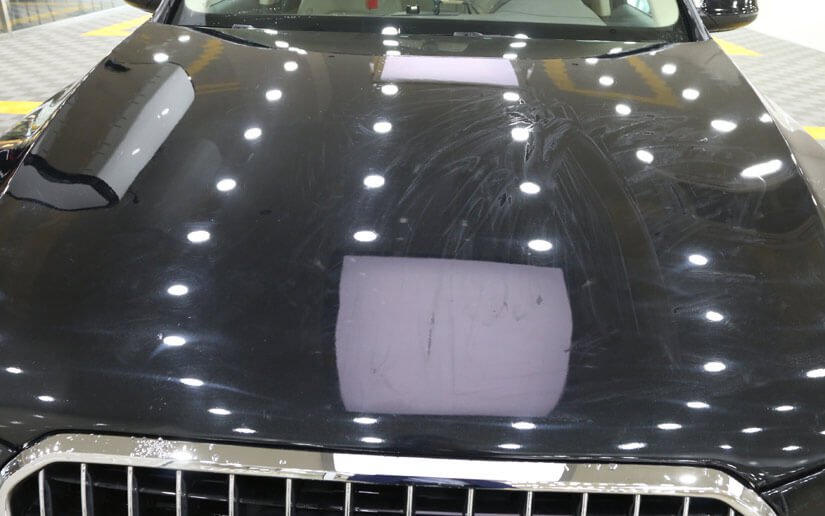 ● 镀晶前我们先检查漆面,很明显可以看到Q5的车漆上的划痕,颜色暗淡无光