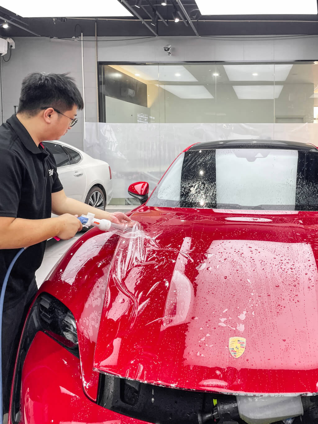 车艺尚配备有专业照明系统和大型喷淋除尘设备,以及标准的车间疏水系统,可以最大限度降低空气中的悬浮颗粒,减少尘点附着。施工环境干净、明亮、整洁,全程无尘施工,保障施工品质。