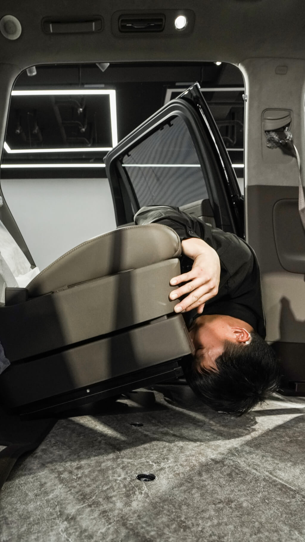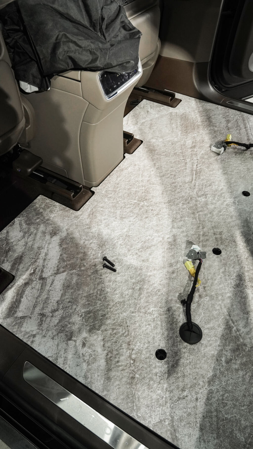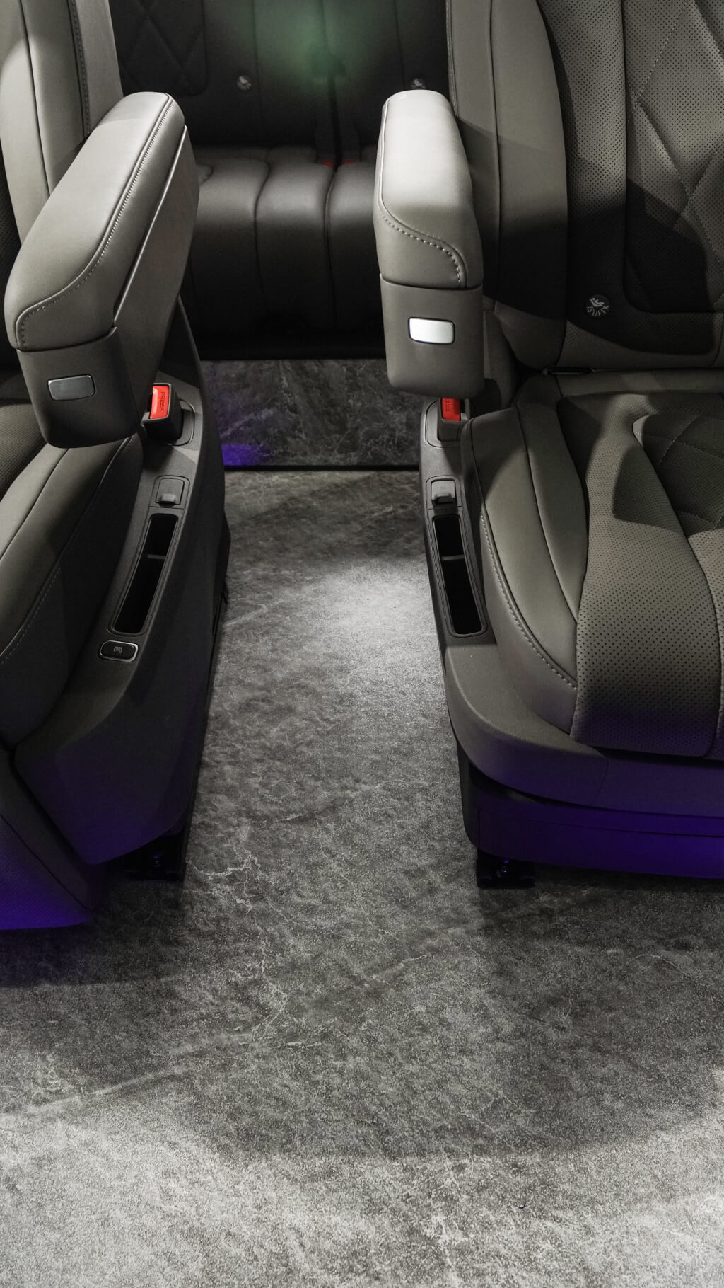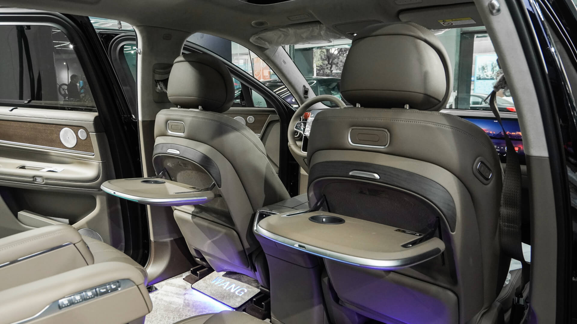 后排两个小桌板已经安装完成,带杯架以及无线充电功能;