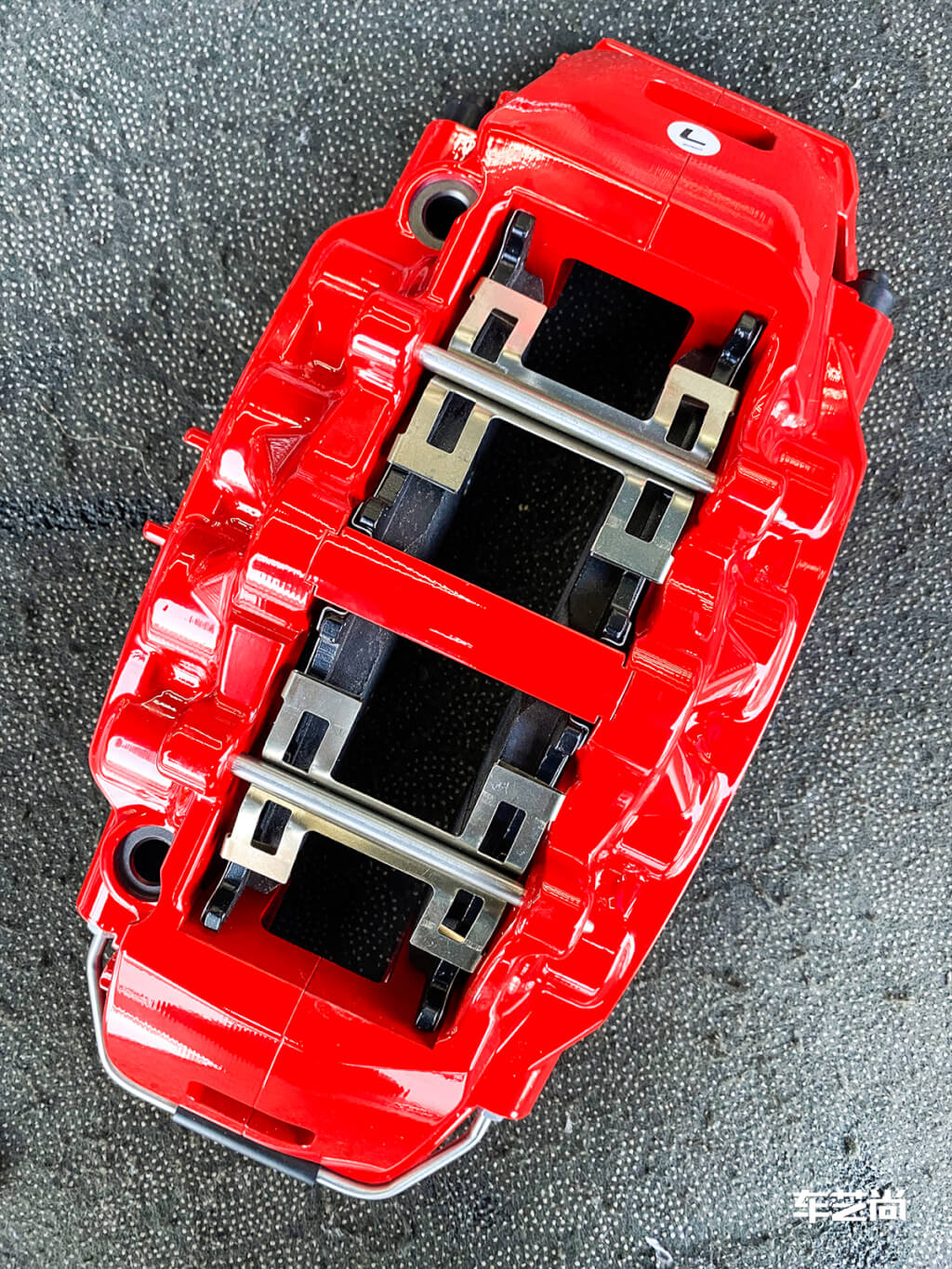 卡钳本体采用成熟可靠的分体锻造工艺,对向8活塞设计,活塞面积56.8CM²;精致时尚的外观,科学极致的镂空偷轻,卡钳净重5.5KG;