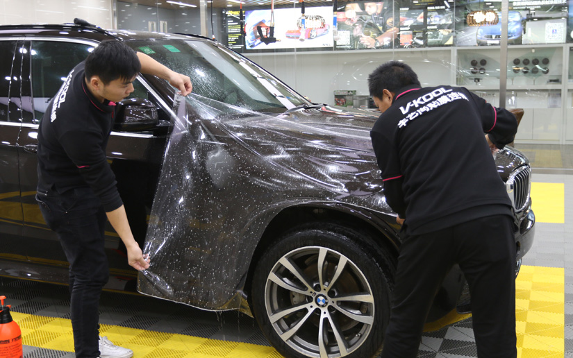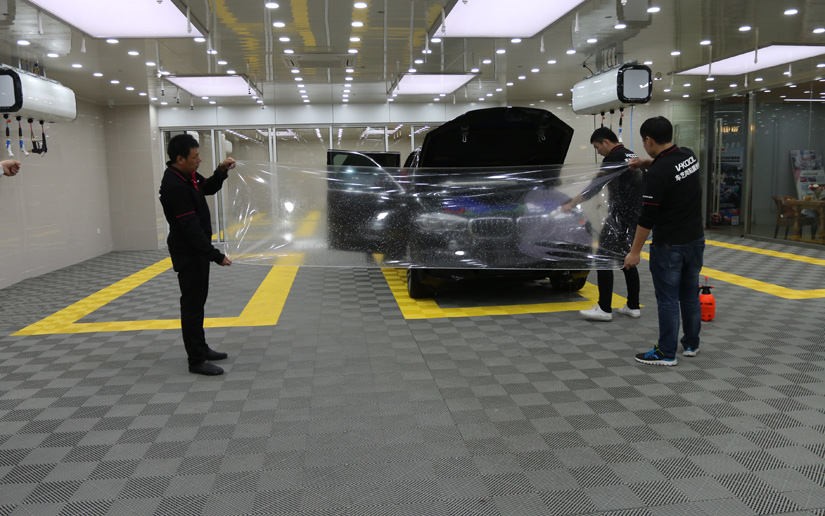 首先是隐形车衣施工,几名技师同时施工,保证贴膜质量的同时加快施工的速度